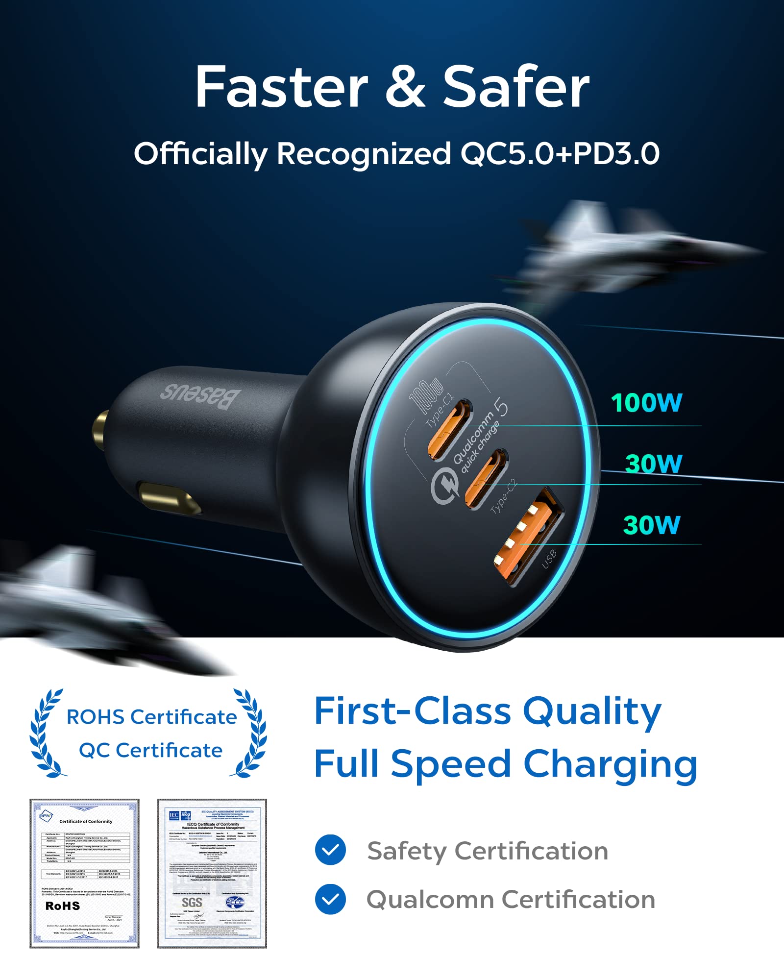 - ⚡【QC5.0 Quick Charge】: Baseus latest and unique 160W USB C Car Charger that supports PPS PD3.0 QC5.0 fast charging, 3 ports 100W+30W+30W independent fast charging technology, single port power will not decrease when 3 ports are used at the same time, can quickly charge 3 devices at the same time.