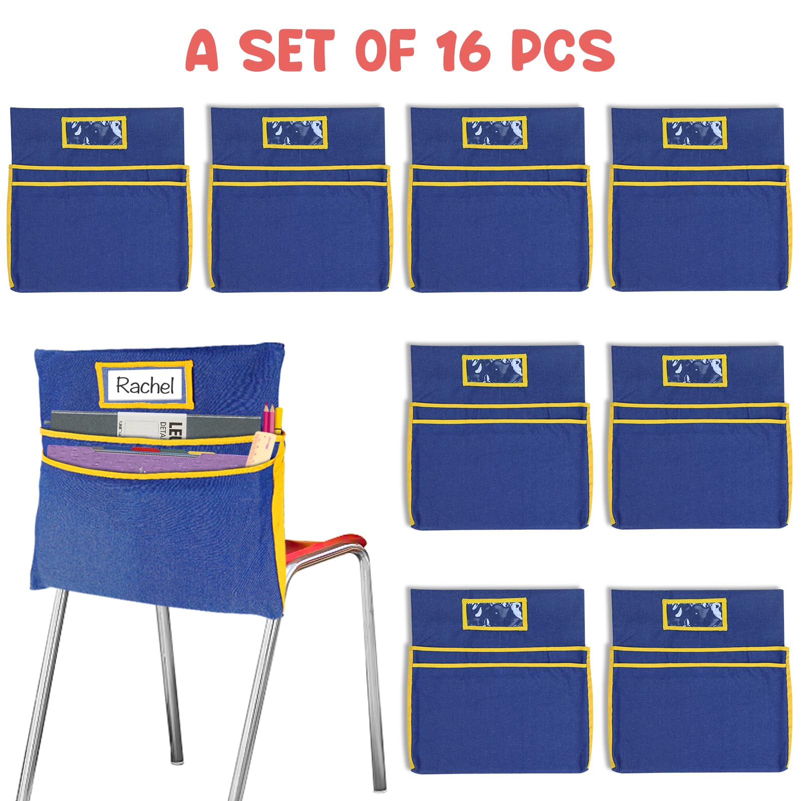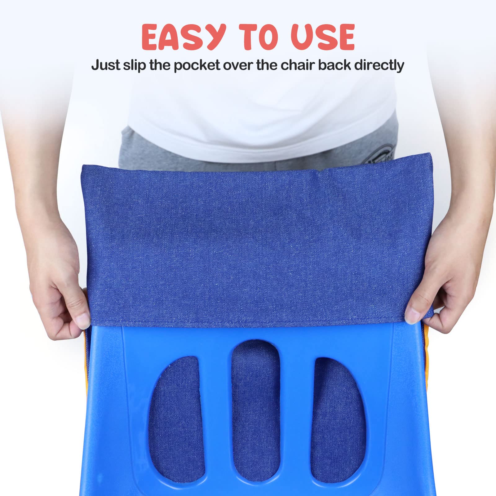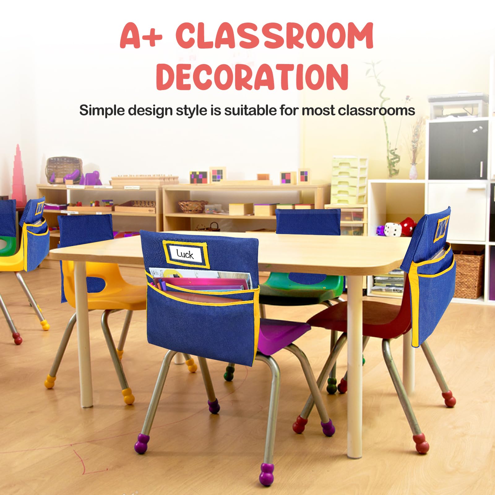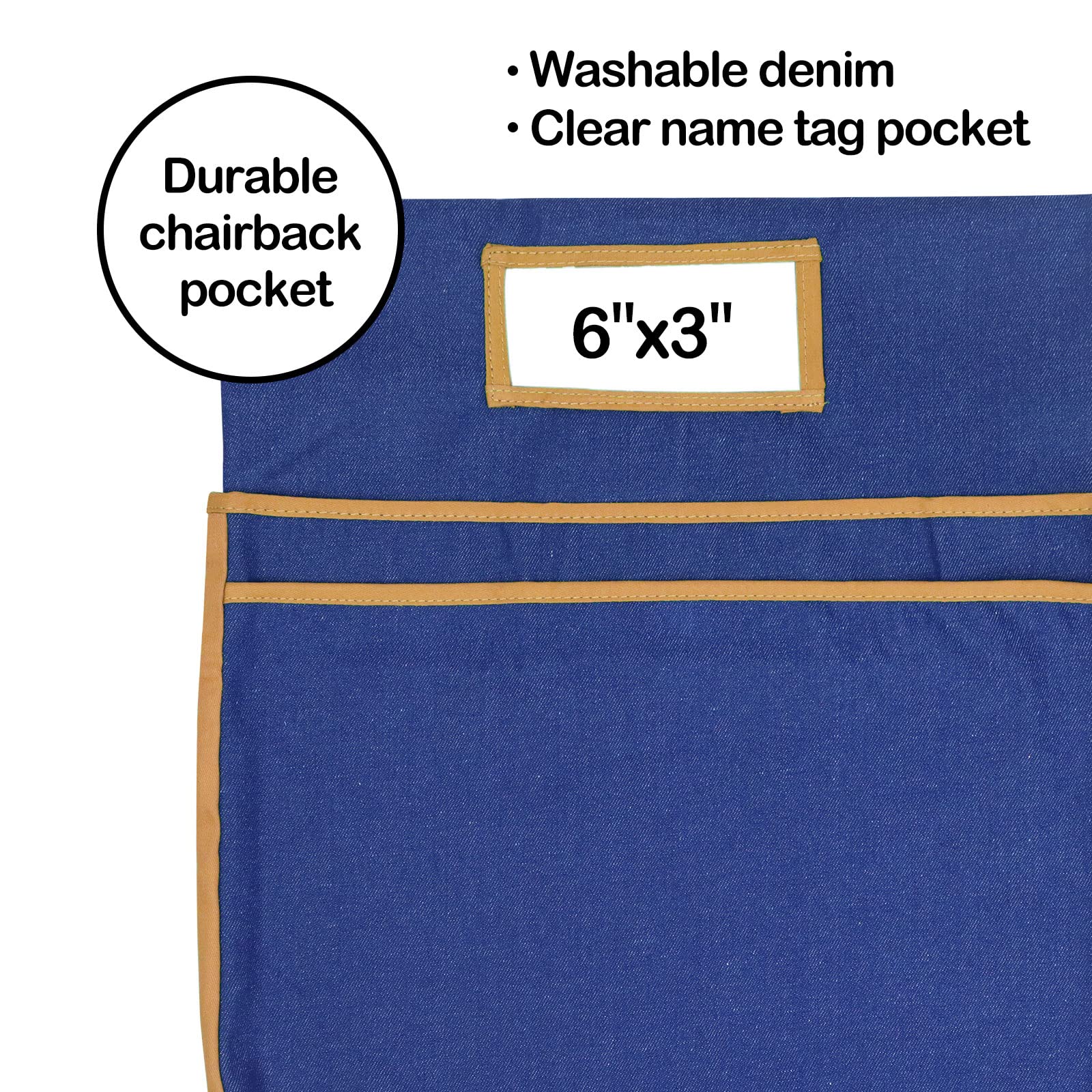 - EASY TO USE:Washable denim easy to keep clean,see-through PVC name slot recognize clearly,easily slip these sturdy chair organizers over the backs of your classroom chairs.Name slot with ample space to hold your student name card. With a clear student name card, children easily recognize their seat storage organizer to keep classroom organized.