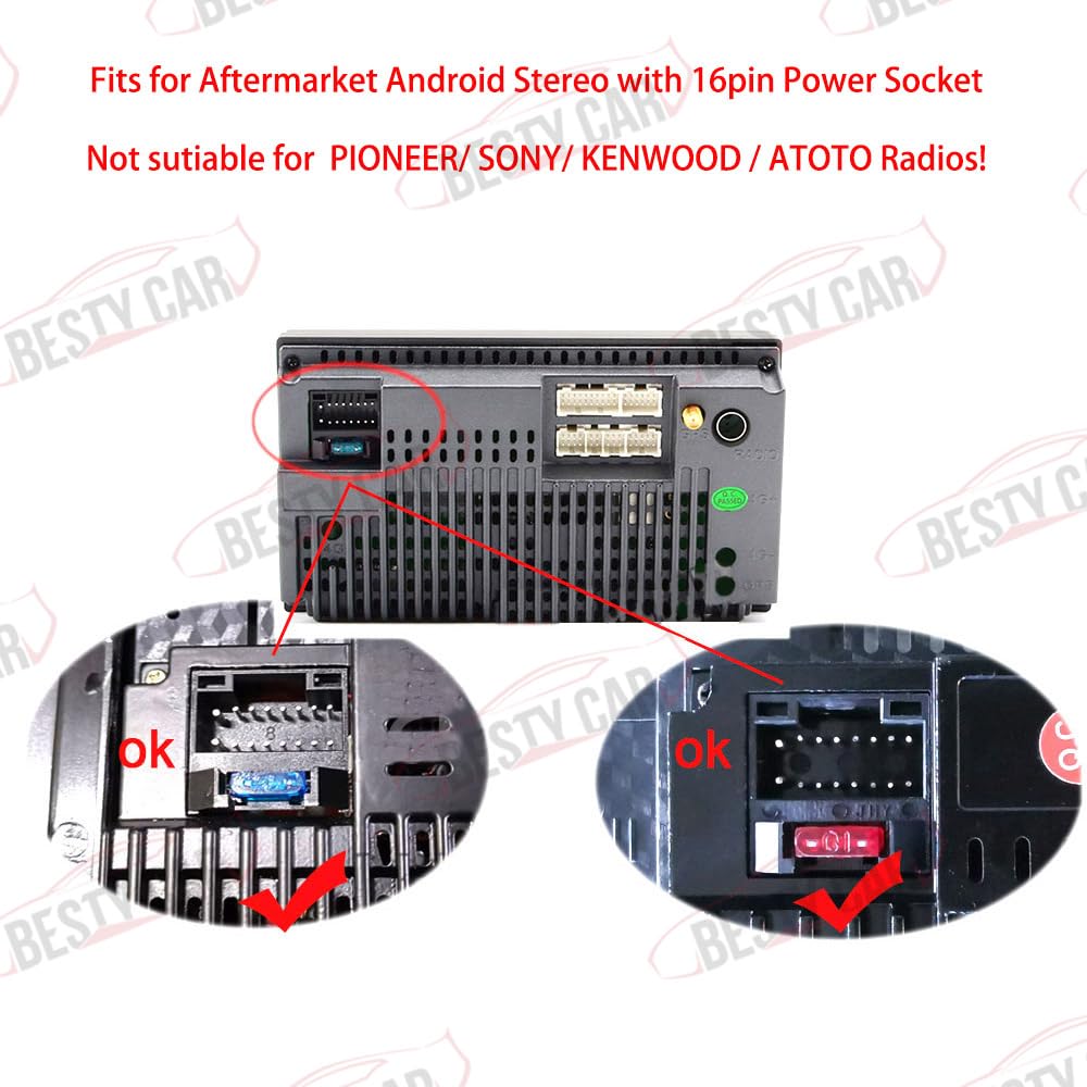 - Notice 1: This car radio power harness is not suitable for Pioneer/Sony/Kenwood/ATOTO radios. It is only suitable for the aftermarket Android radio with universal 16pin power socket like shown in description.