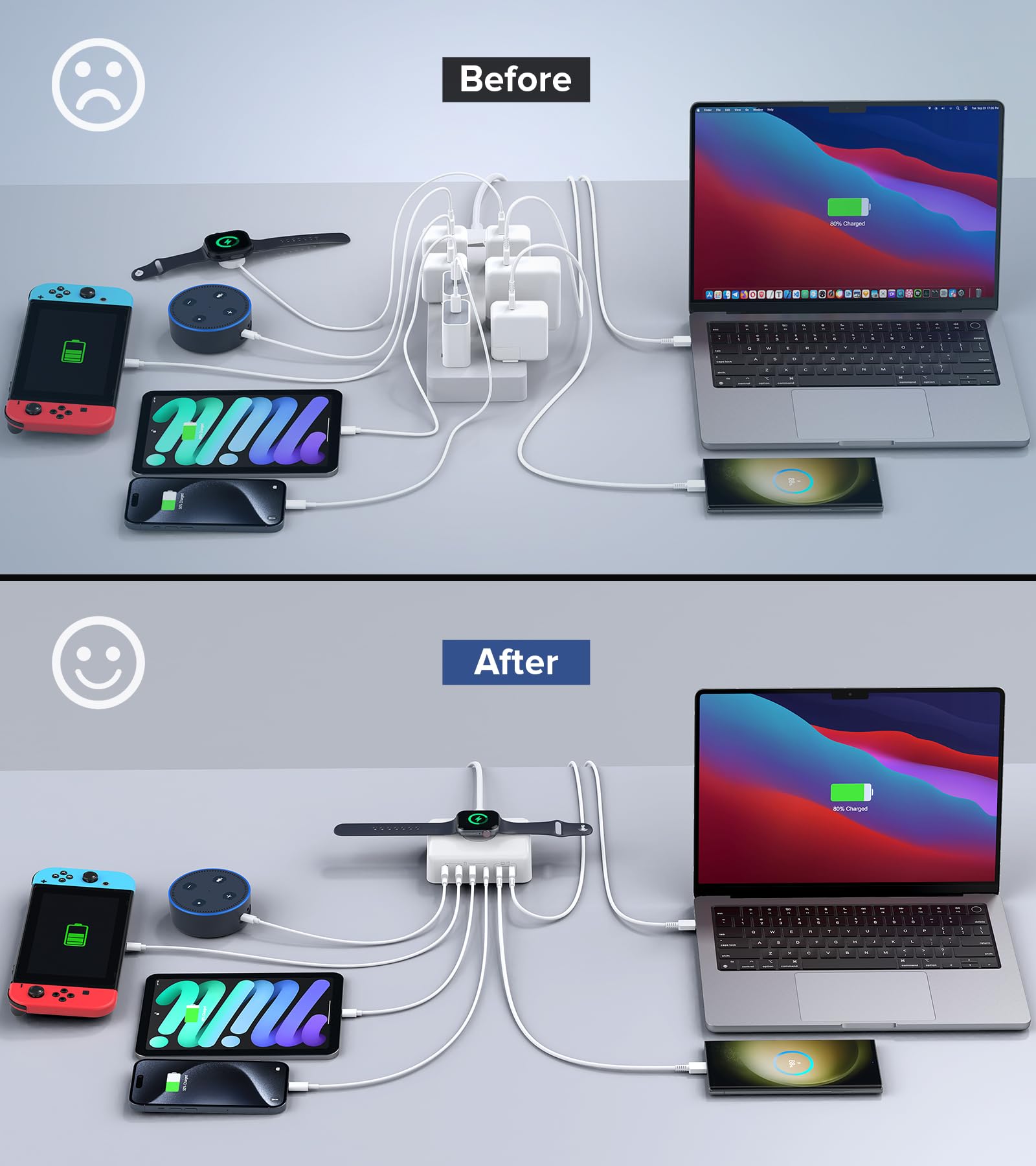 - 【Safety & Reliability】Built with premium Navitas Gallium Nitride (GaN) chipsets operate more efficiently and generate less heat.The multiport USB C desktop charging station boasts over-current, over-voltage, short-circuit, and overheating protection, maximizing the charging safety. USB C wall charger passed UL CE FCC RoHS safety certification ensures 100% complete protection for you and your devices