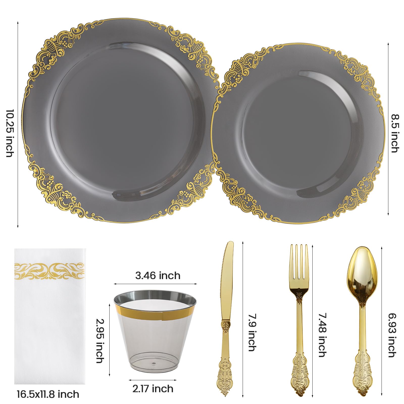 - [WHAT YOU GET]:Our 175-piece disposable dinnerware set is tailor-made for your 25 guests.This plastic dinnerware set includes 25 dinner plates,25 salad/dessert plates, 25Spoons,25 Forks,25 Knives,25 Napkins,and 25 cups,Our disposable dinnerware set is a great convenience and recommendation for weddings,parties,holiday.