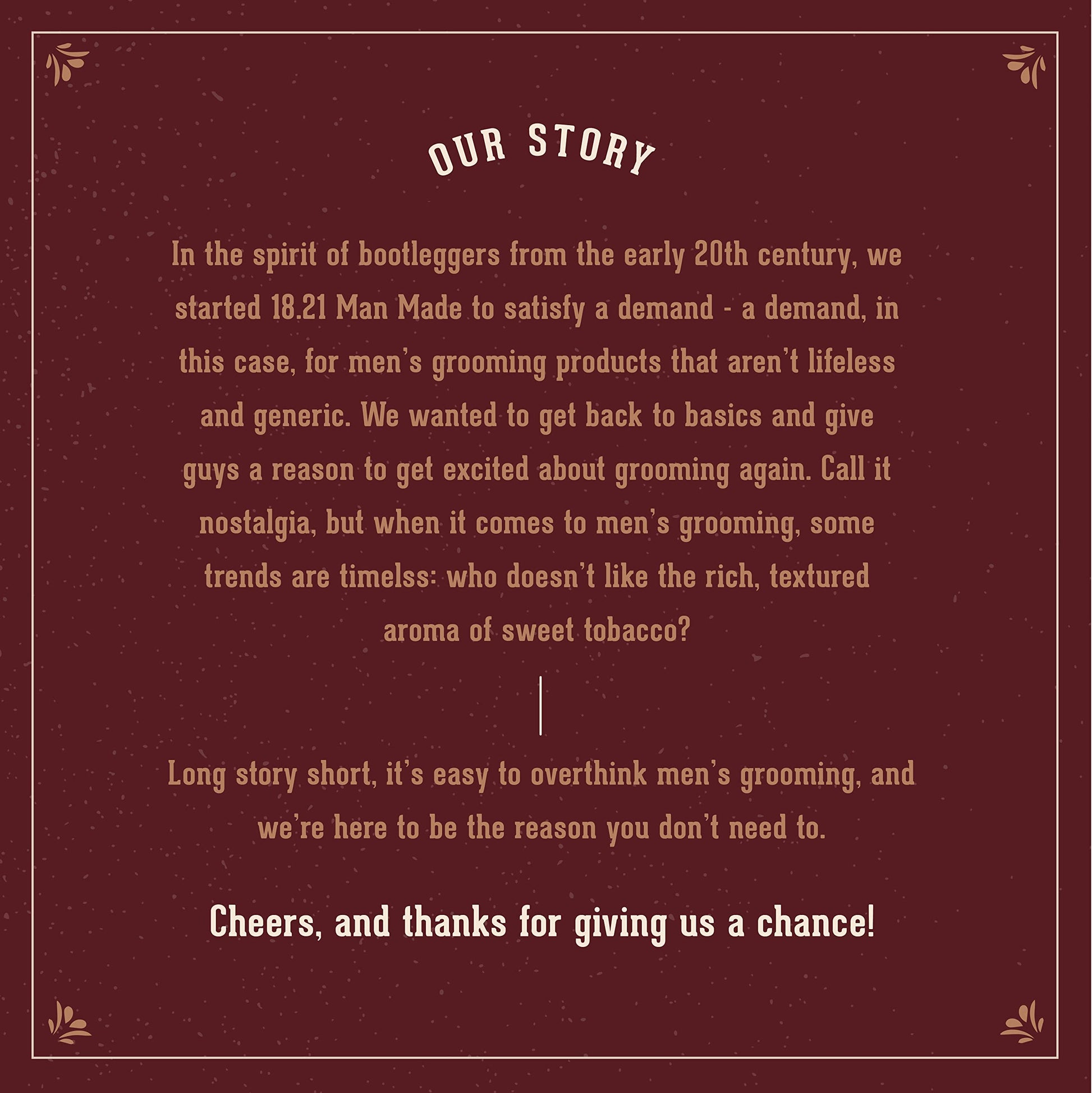 Man Made Wash features 18.21 Man Made's signature Sweet Tobacco oil blend. A masculine aroma inspired by sweet Virginia pipe tobacco and the roaring spirit of swanky Prohibition era speak easy lounges. The first impression will introduce notes of spicy saffron and dried fruit which, will mellow during the dry down to reveal notes of manuka honey, dark toned vanilla and tonka bean to sweeten the touch of tobacco, exotic woods and powdery musk that round out the base. Leaves a lasting impression.