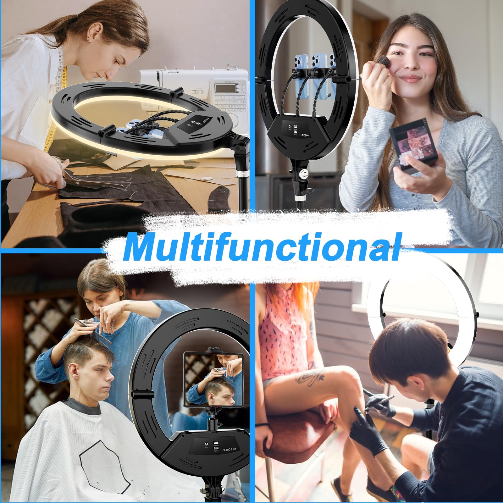 - 【Tablet Holder& 3* Phone Holder】This ring light(aro de luz) comes equipped with 1* tablet holder (compatible with 4-12.9'' tablets), 1* cold shoe adapter for most DSLR cameras, and 3* universal phone holders, meeting the lighting needs for tablets, phones, and cameras. The ipad photo booth stand is suitable for live streaming, makeup, Zoom meetings, video recording, gaming streams, indoor shooting, nail art lighting, salons, travel vlogging, Vlogs, group selfies, hairdressing, photography studios, food preparation, painting, crafting, and online teaching.