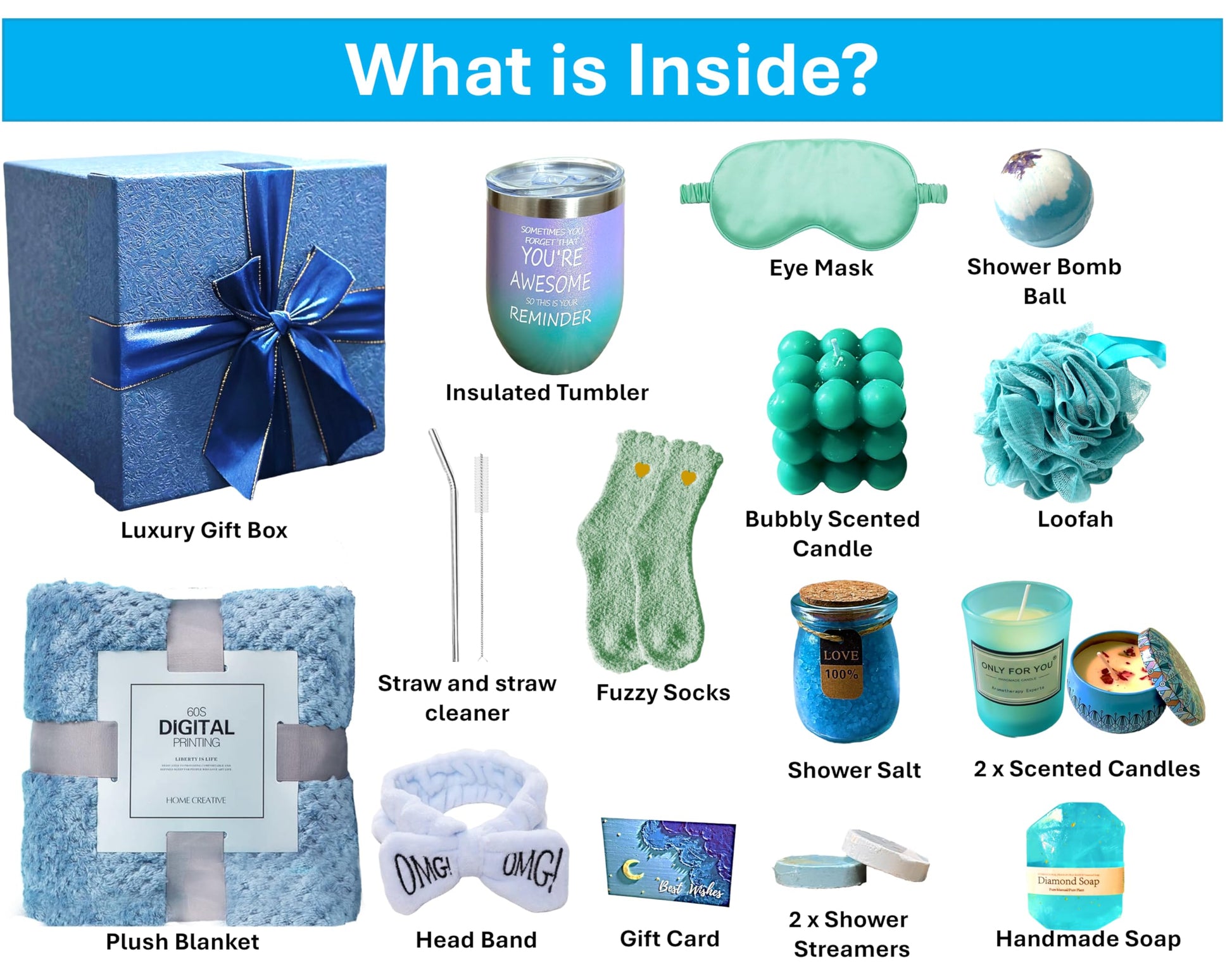 - đăPREMIUM, UNIQUE AND LUXURY CARE GIFT SET FOR WOMENă Each box is a set of comforting and therapeutic items, containing 12oz tumbler with a steel straw and cleaning brush, 2 x scented candles, a plush blanket, bubbly scented candle, a pair of cozy fuzzy socks, 2 x bath bomb pieces, bath ball, creamy diamond handmade soap, silk eye mask, headband, shower salt, loofah, and a heartfelt greeting card.