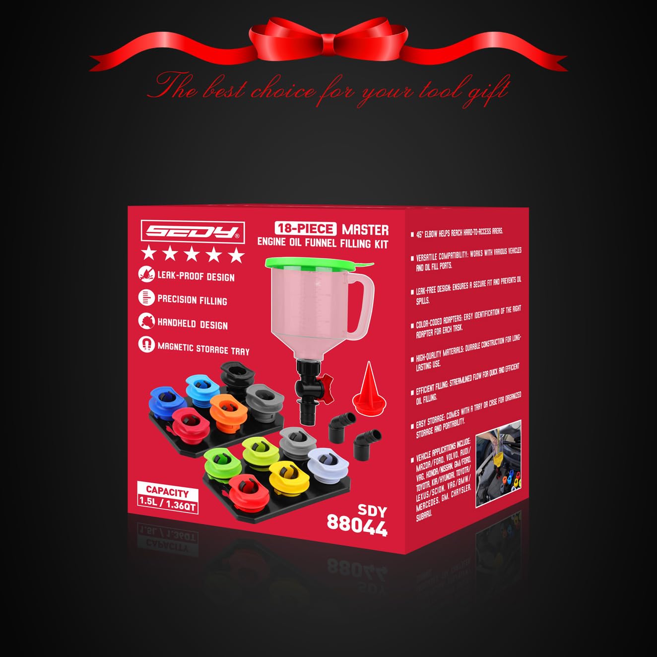 18-Piece Engine Oil Funnel Set, 1.59QT/1.5L Automotive Oil Funnel Kit with 12 Adapters, Elbow Fitting, Arrow Screen and Magnetic Storage Hooks Tray, Compatible with GM, Ford, BMW, Audi, Land Rover Etc
