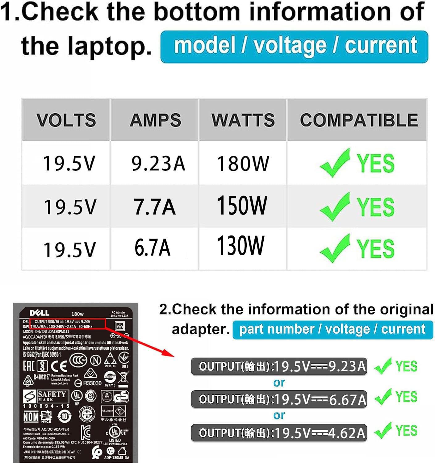 - Power Product Type :Fit for DELL Laptop Charger Output Max: DC 19.5V, 9.23A, -180W (19.5V 7.7A 150W; also compatible) Input Volt Range: 100-240V-50/60HZ, Connector size:7.4*5.0mm (7.4mm outer Diameter, 5.0mm inner Diameter with central pin). UL Safety Tested. ) !!! Please Note !!!(NOT FIT Connecter size:4.5mm*3.0mm and Power 19.5V 12.3A 240W )