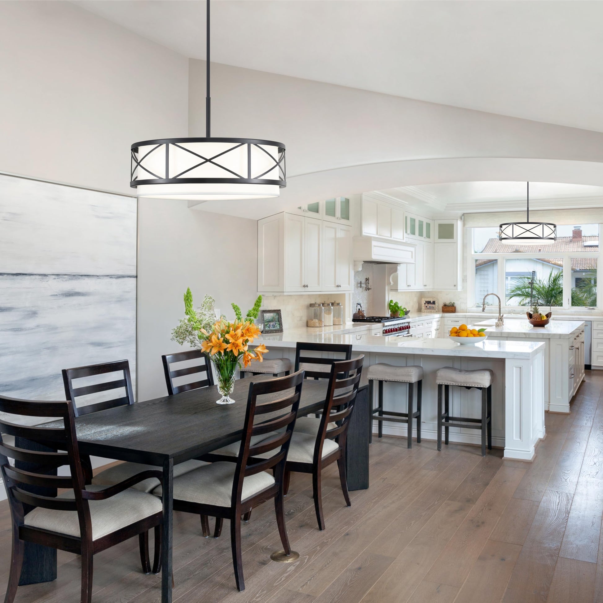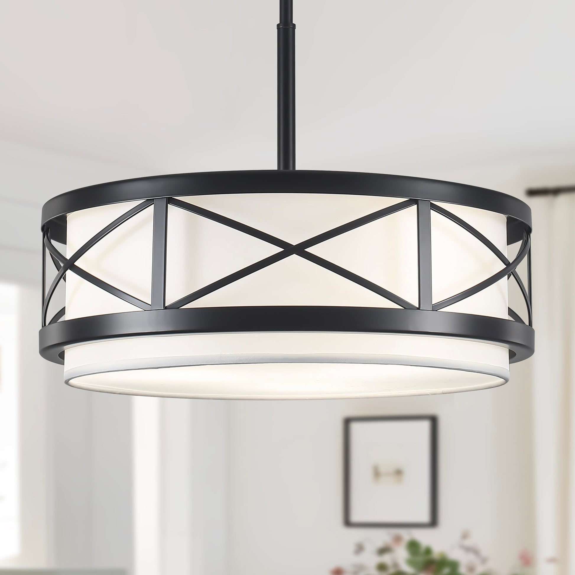 - 【Unique Shape Drum Chandelier】The modern chandelier showcases a modern, minimalist design with a sleek aesthetic. Its circular lampshade is encased in a black metal frame featuring intersecting X-shaped patterns, which add both visual depth and decorative appeal. The interior of the lampshade is white, allowing light to diffuse softly. A diffuser at the base emits a warm, inviting glow, creating a cozy ambiance