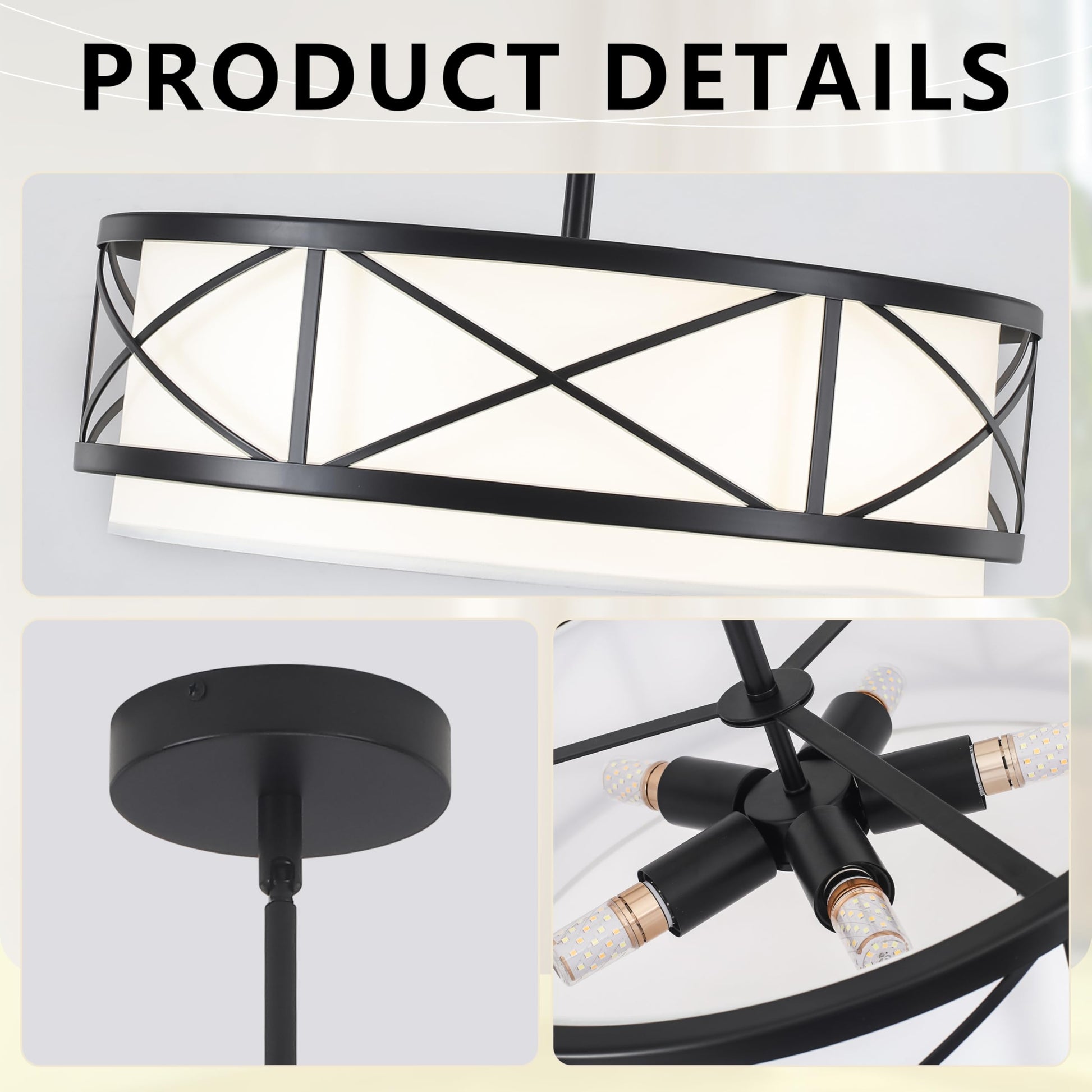 19.7'' Black Drum Chandelier, 5-Light Modern Drum Farmhouse Chandeliers for Dining Room Light Fixture Hanging Pendant Light with White Fabric Shade for Kitchen Living Room Foyer Entryway Bedroom