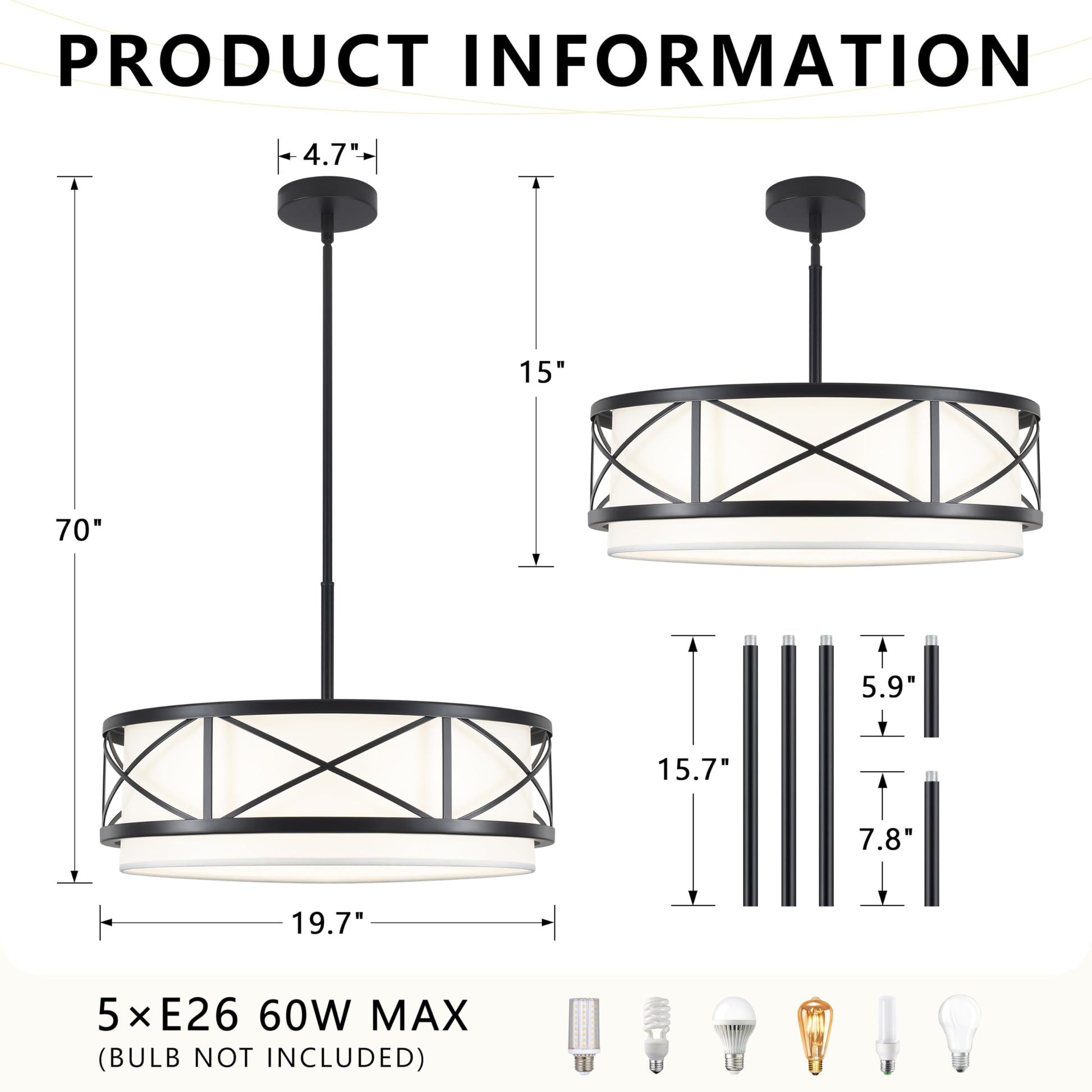 - 【Suitable Dimension & Adjustable Height】This drum chandelier has a diameter of 19.7 inches and accommodates 5 E26 bulbs. It includes three 15.7-inch rods and one 7.8-inch rod, offering adjustable height to suit various ceiling heights. Perfectly tailored to meet both your size and brightness requirements, it provides ideal lighting for your dining room