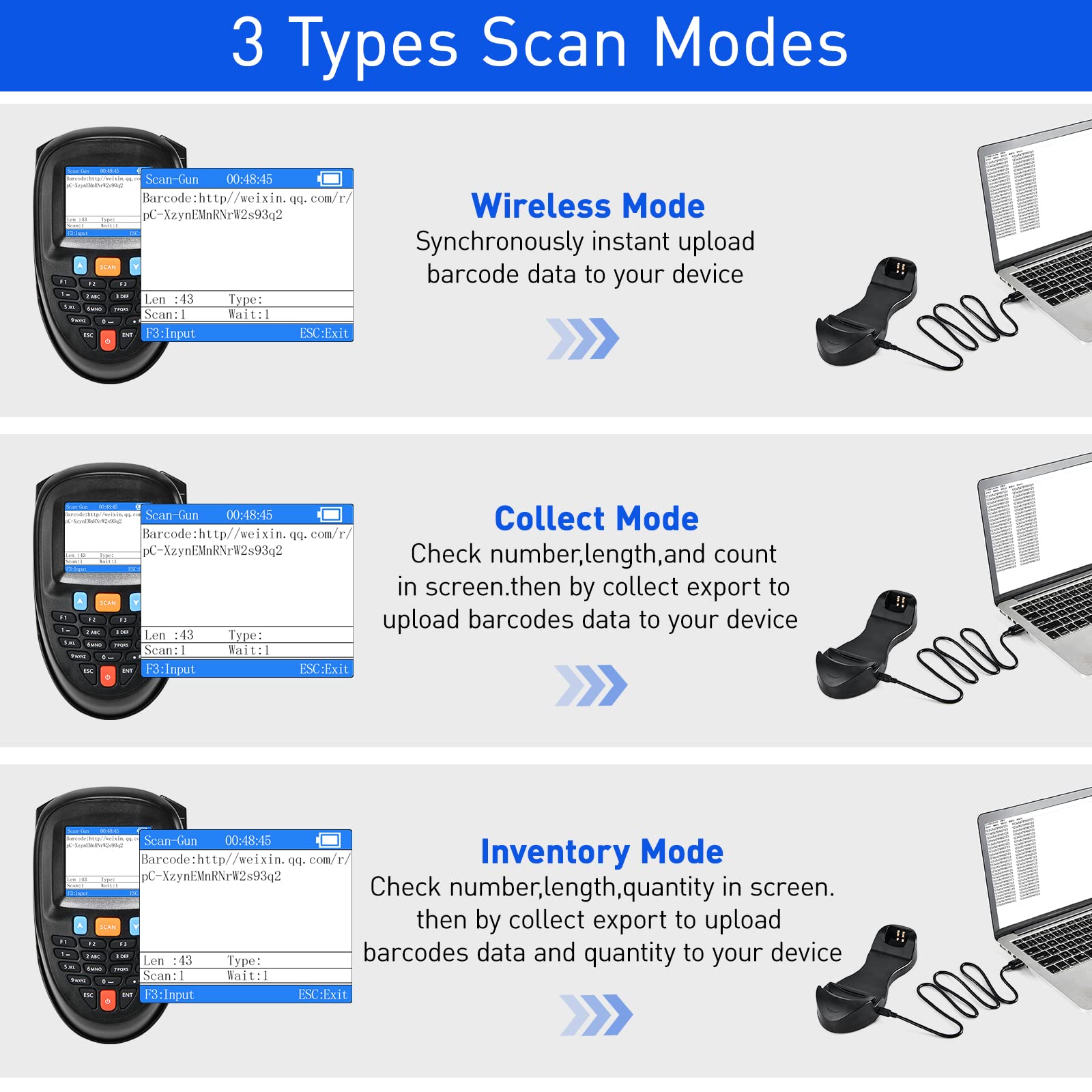 - 【Multi-function】- Scanner gun, Data collect, Inventory mode etc. Widely Used in Express, Supermarket, Retail, Drugstore, Warehouse and Other Industry. Equipped with 2.2-inch HD color screen, JRHC Wireless Barcode Scanner Can Display the Current Wireless Channel Esed, Wireless Signal Strength and Battery Power. Users Can View Barcode Content, Type and Length in Real Time
