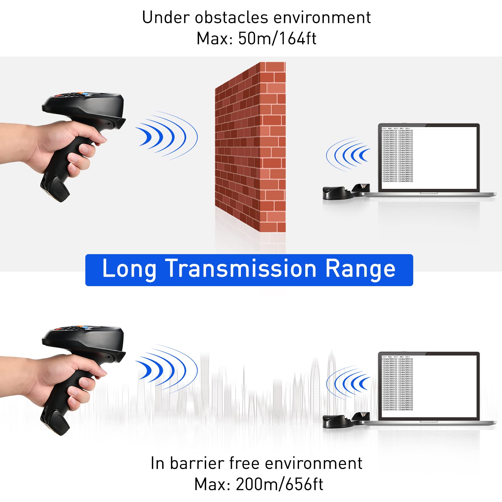 - 【2.4G Wireless Long-distance Transmission】- Our wireless barcode scanner is connected to the computer through a 2.4G wireless USB receiver, supports WINDOWS XP/7/8/10 system, and is compatible with office software such as WORD/EXCEL/Text; the inventory barcode scanner transmits distance when there is no obstacle outdoors It can reach 200M/656 feet, and it can reach 50M/164 feet when there are obstacles or indoors