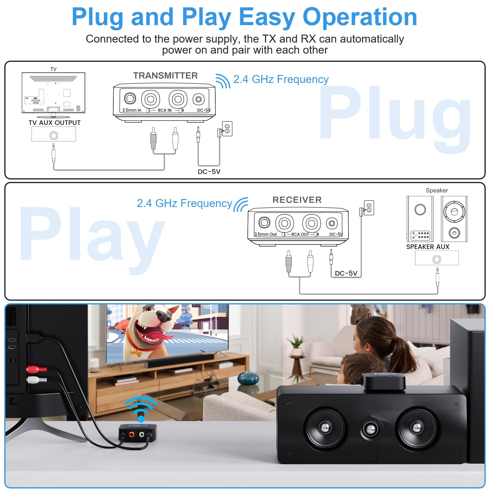- 【2.4GHz Hi-Fi Audio Enjoyment】The audio adapter kit features 2.4GHz true wireless connection, no more cords, freely enjoy high fidelity music. Very suitable for home TV, PC, MP4 office audio speaker connection, get rid of distance limitation and enjoy high quality stereo streaming audio at every corner of your home. Please NOTE: the audio kit is not suitable for subwoofer.