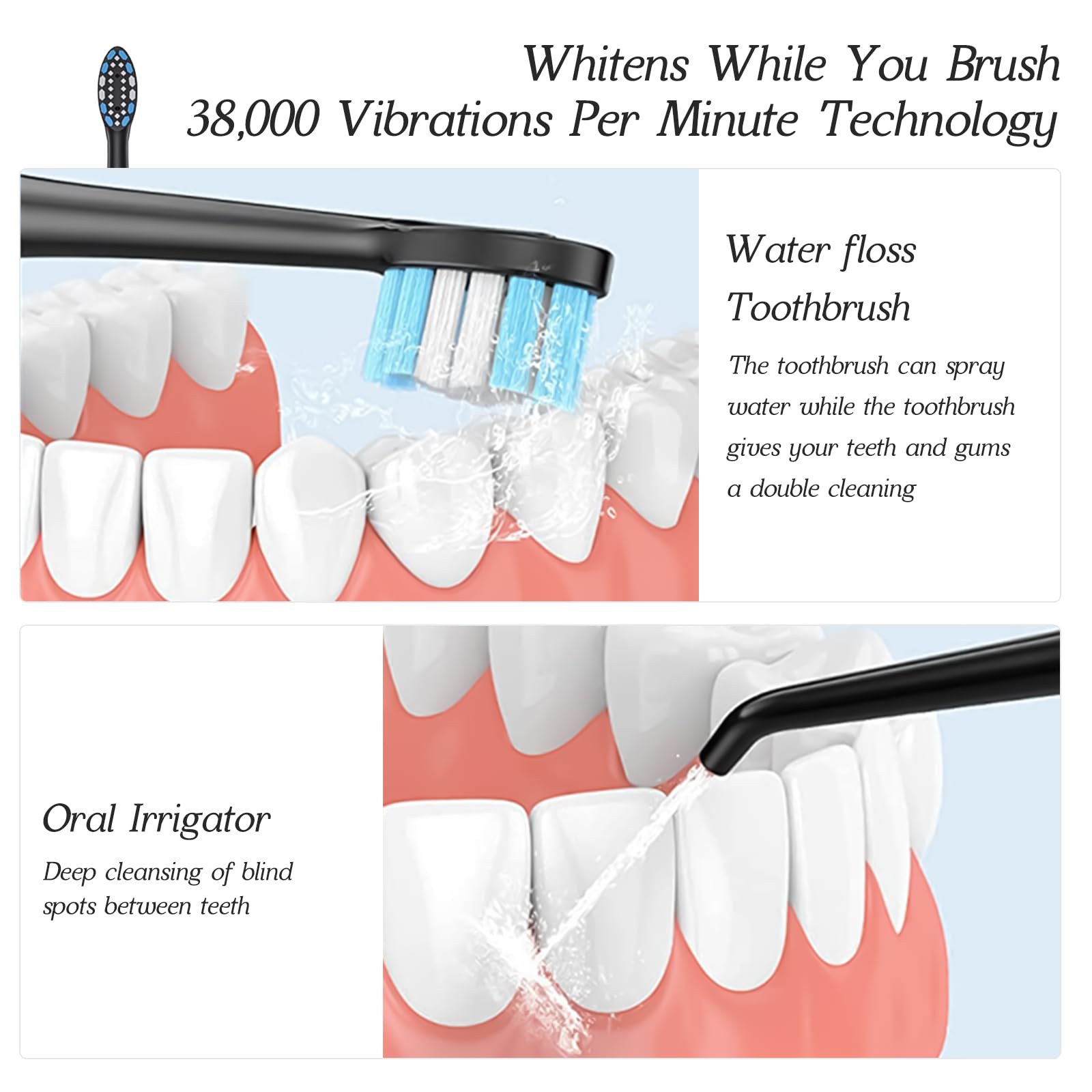 2-1 Professional Electric Toothbrush with Water Flosser, 3800VPM Ultrasonic Water Dental Flosser Toothbrush Combo- 4 Modes & 4 Intensity Levels, Brushing & Flossing for Home and Travel, Black