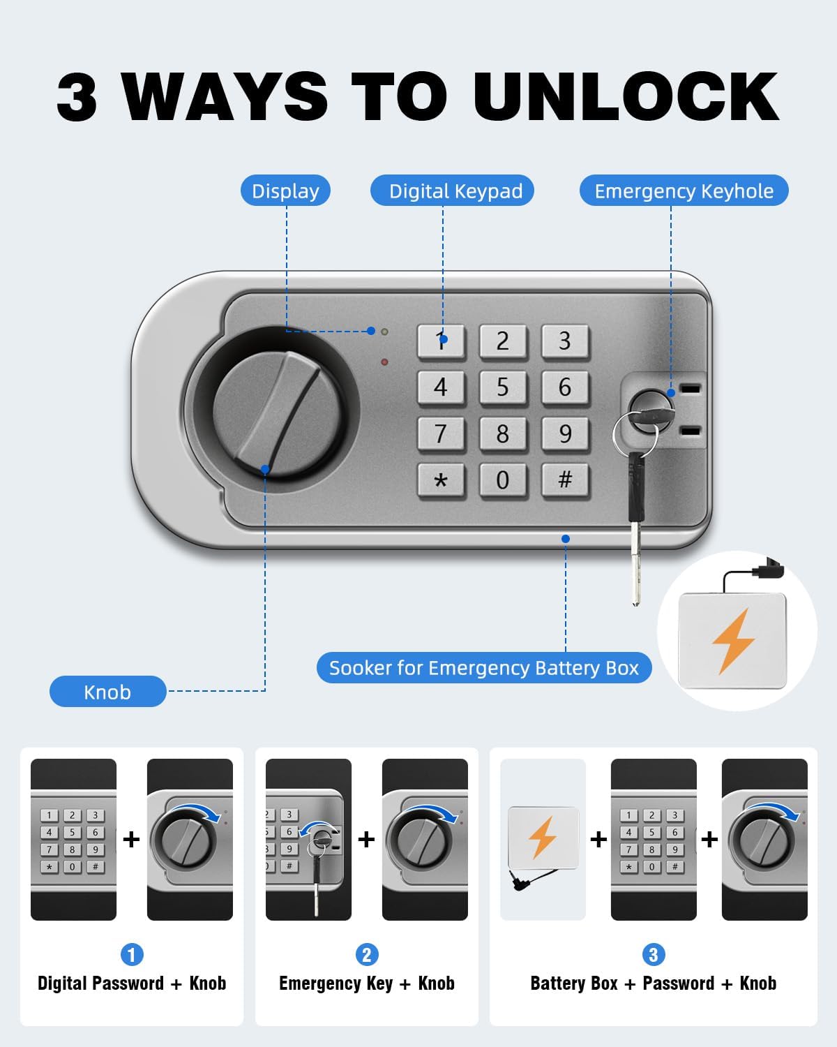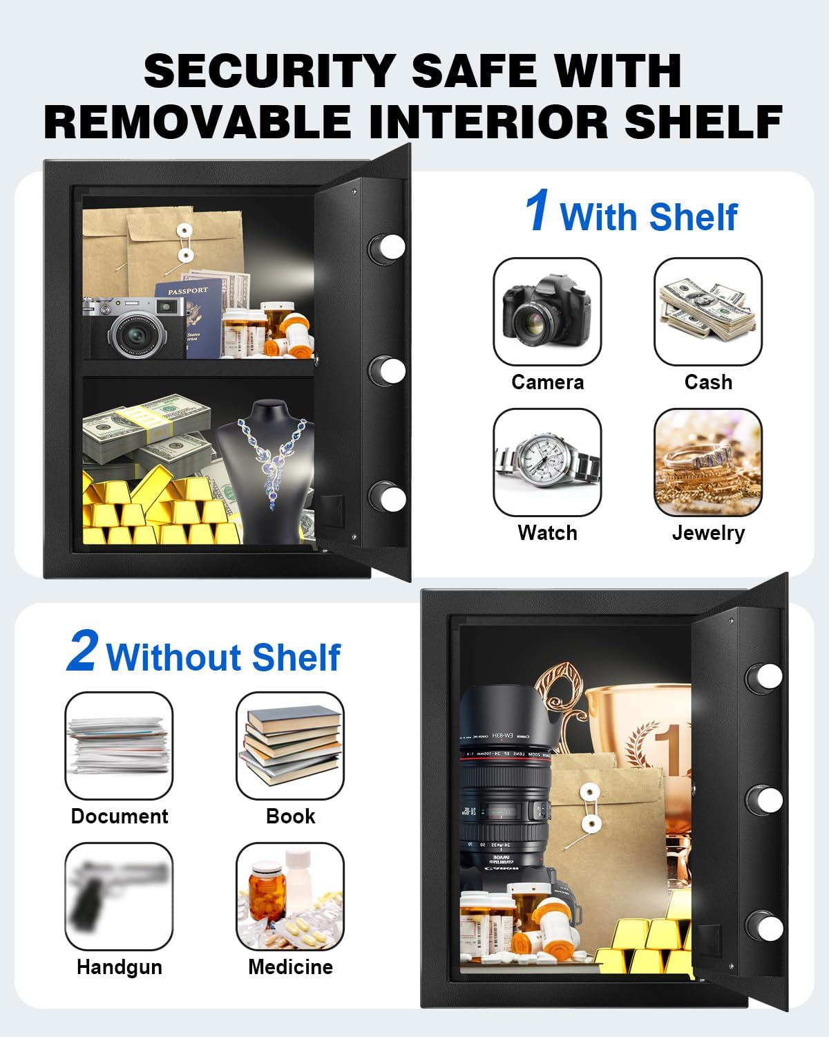 - 【2.4 Cubic Safe Box】With its compact and spacious design, it comes with removable shelf, making it perfect for storing items around the home such as cash, medications, jewelry, sensitive documents, electronic storage drives, spare credit cards, and firearms. It can be easily placed in a closet, cabinet, shelf, drawer or nightstand as a hotel safe, closet safe, wall safe and dorm safe. Concealed and flexible (flexible and easy to hide), Ideal for home, office