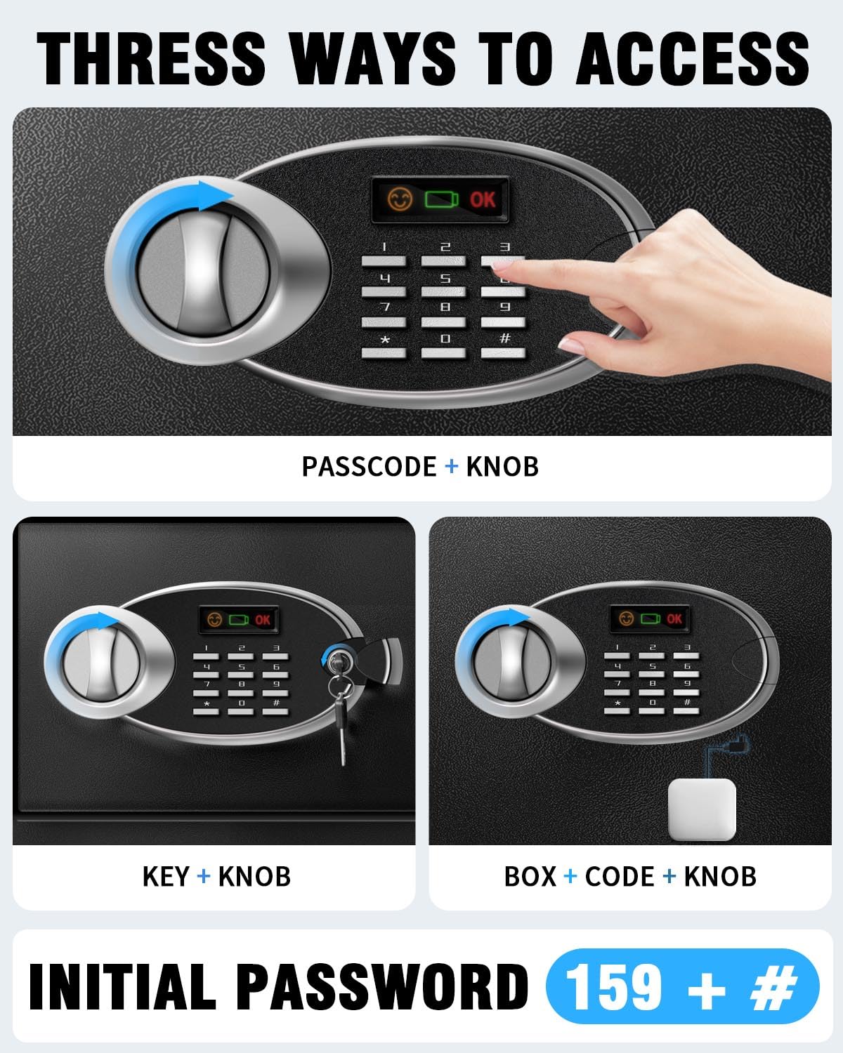 - 【ANTI-THEFT ALARM】: Our home safe comes with a dual alarm system to prevent password guessing and effectively deter unauthorized access. Enter the wrong password 3 times in a row will activate the alarm system and the safe will lock for 20 seconds