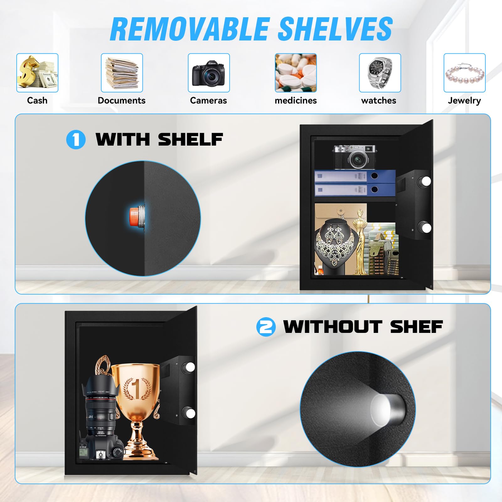 - 【REMOVABLE SHELVES】: This fire safety boxes for home, featuring removable shelves, can accommodate a wide range of items, including documents, cash, jewelry, and electronics, thus enhancing its practicality. Moreover, the removable shelves simplify the cleaning of the safe's interior, as they can be removed and cleaned individually. This ensures improved hygiene and better care for the stored items