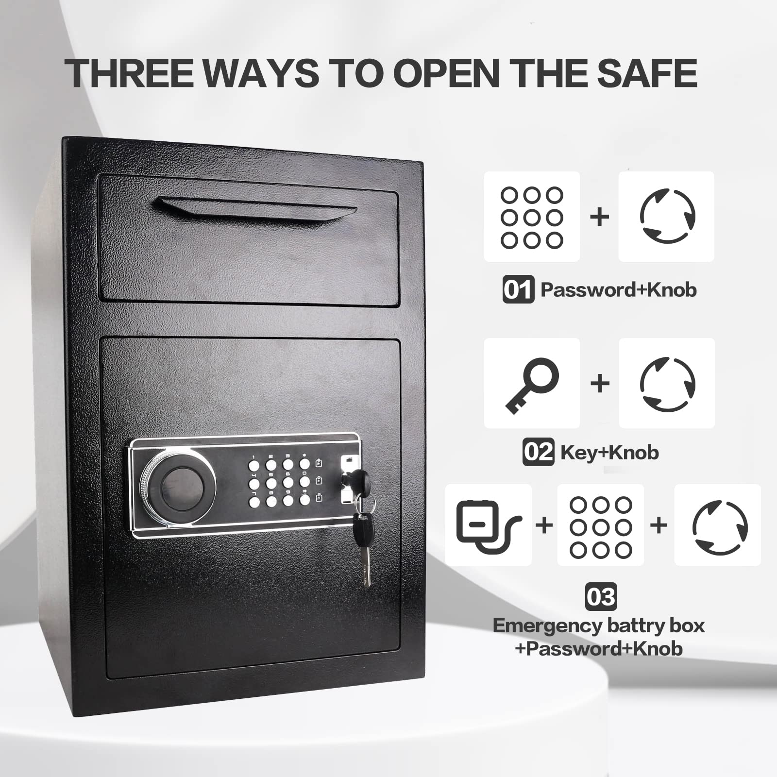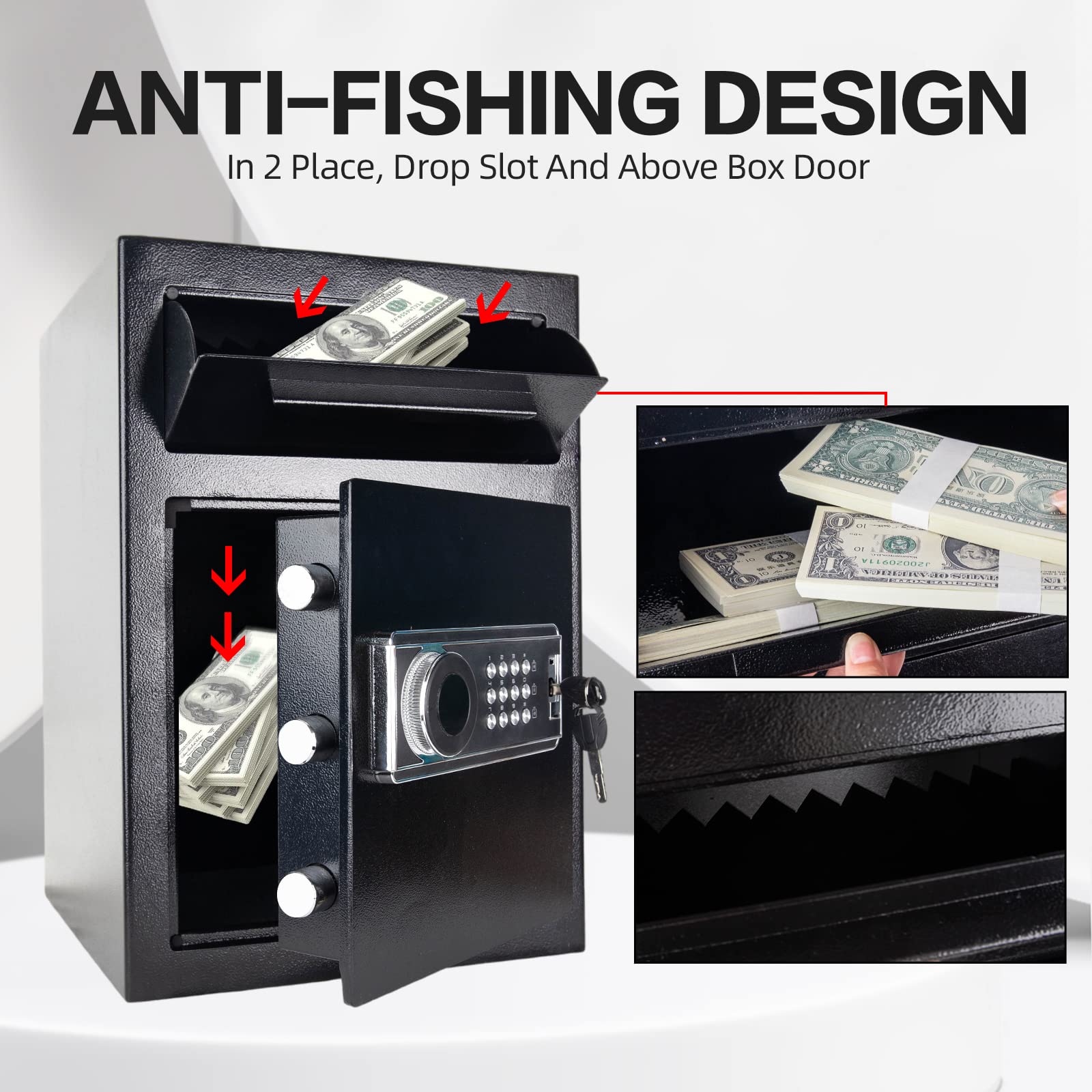 - 【 SAFE WITH DROP SLOT】Anti-fishing design With drop slot in the front. This design assuring an excellent protection for any valuable items kept inside the safe, and a handle on the drop slot adds more conveniences.Large depository safe provides protection for cash, receipts, deposit slips, keys and other valuables against theft and burglaries.