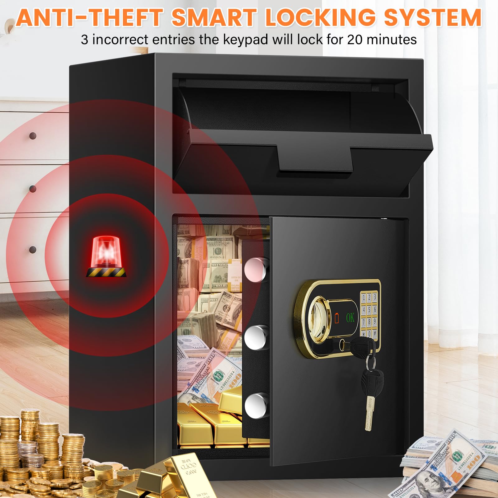 - QUICK ACCESS COMBINATION LOCK STEEL SAFE: Digital depository drop box is equipped with an electronic keypad lock. You can set a 3-8 digit password for your safe to prevent strangers from opening it at will. The safe is also equipped with two emergency keys. Even if you forget the password, you don't have to worry that your items can't be taken out. This safe is perfect for securing items AWAY FROM KIDS, THIEVES AND PEOPLE YOU DON'T TRUST