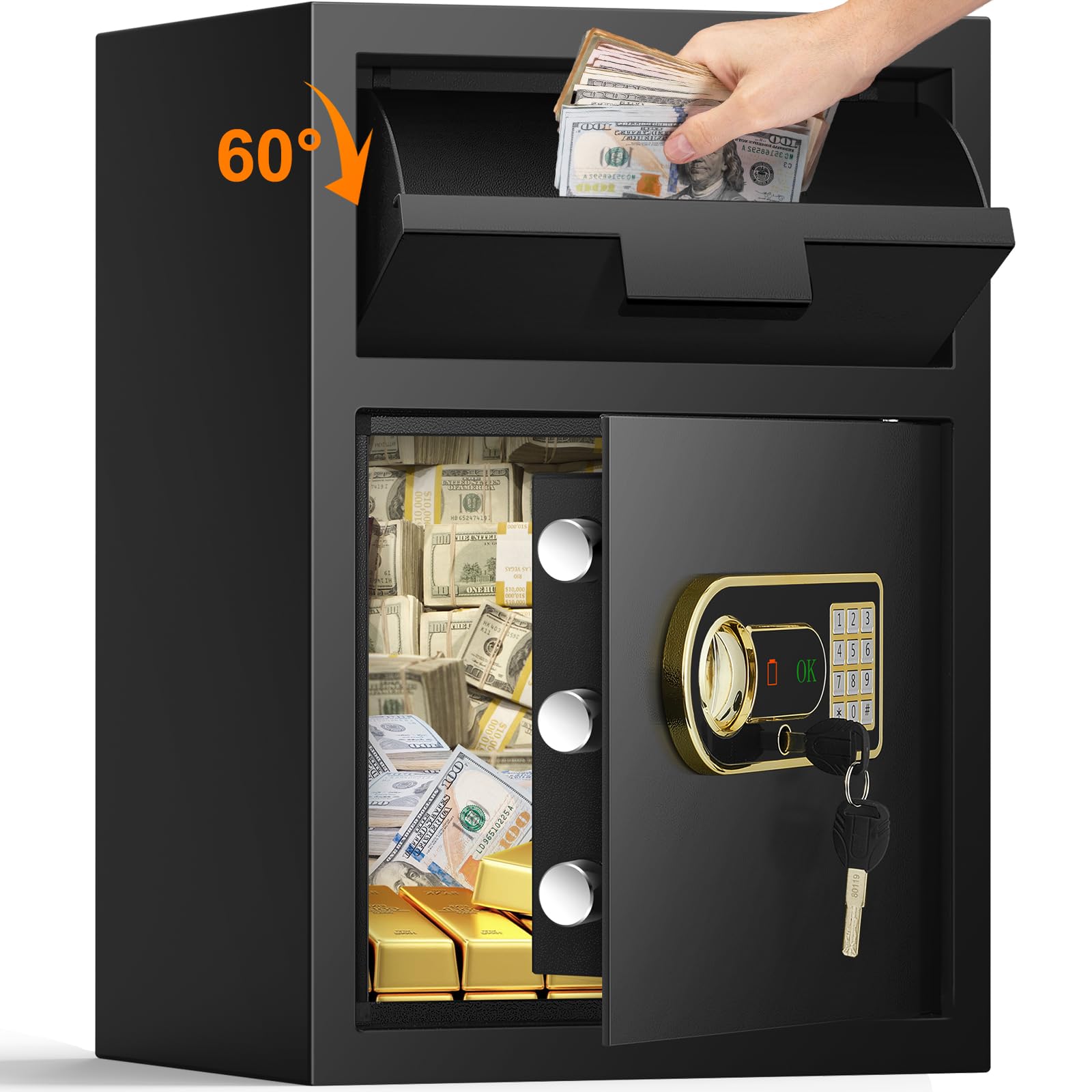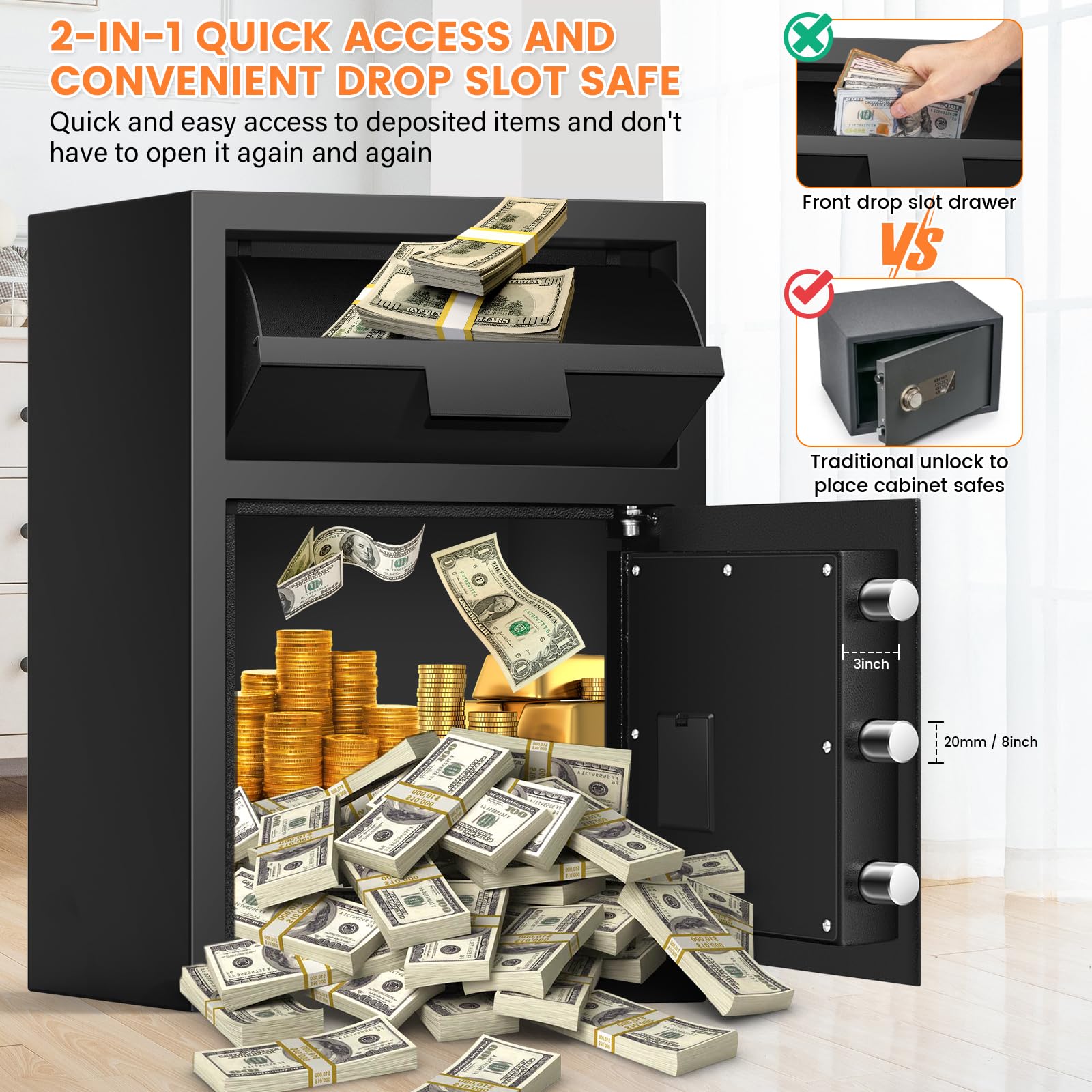 - LARGE CAPACITY DROP SAFE FOR BUSINESS: 2.8 cubic Large drop slot safes can protect almost all valuable assets and belongings, such as money, check payment, files, documents,birth certificates, social security cards. Money safe is a perfect choice for retail store, church, hotel, bank, office, home any cash-business. The security drop slot safe designed with two individual functions, it can meet the demand of two different positions(drop and security storage)at the same time