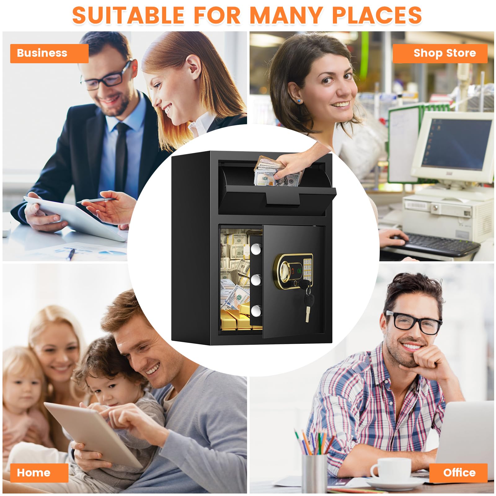 - STURDY ALL STEEL STRUCTURE: Our cash drop safe box is good in anti-drilling, anti-prying, anti-collision and anti-falling. With 4mm integrated metal door panell and 2 pry-resistant shaped hinges, making the electronic drop safe money box safe and sturdy, provides long-lasting and reliable protection against forced entry. The drop slot allows for you to just drop your deposits in without openg the door is is quick and convenient for home retail store busines menbers