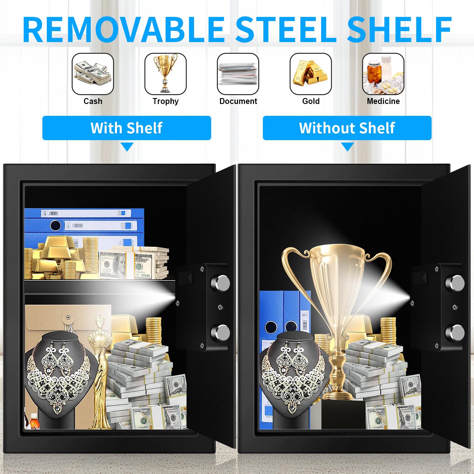 - 🔥🔥🔥【DIGITAL SAFE WITH COMBINATION LOCK】Our safe box is designed with electronic keypad and spare keys. The programmable code makes it easy to open the safe and you don’t have to worry about hiding & keeping track of a key. It worked perfectly to keep something away from kids