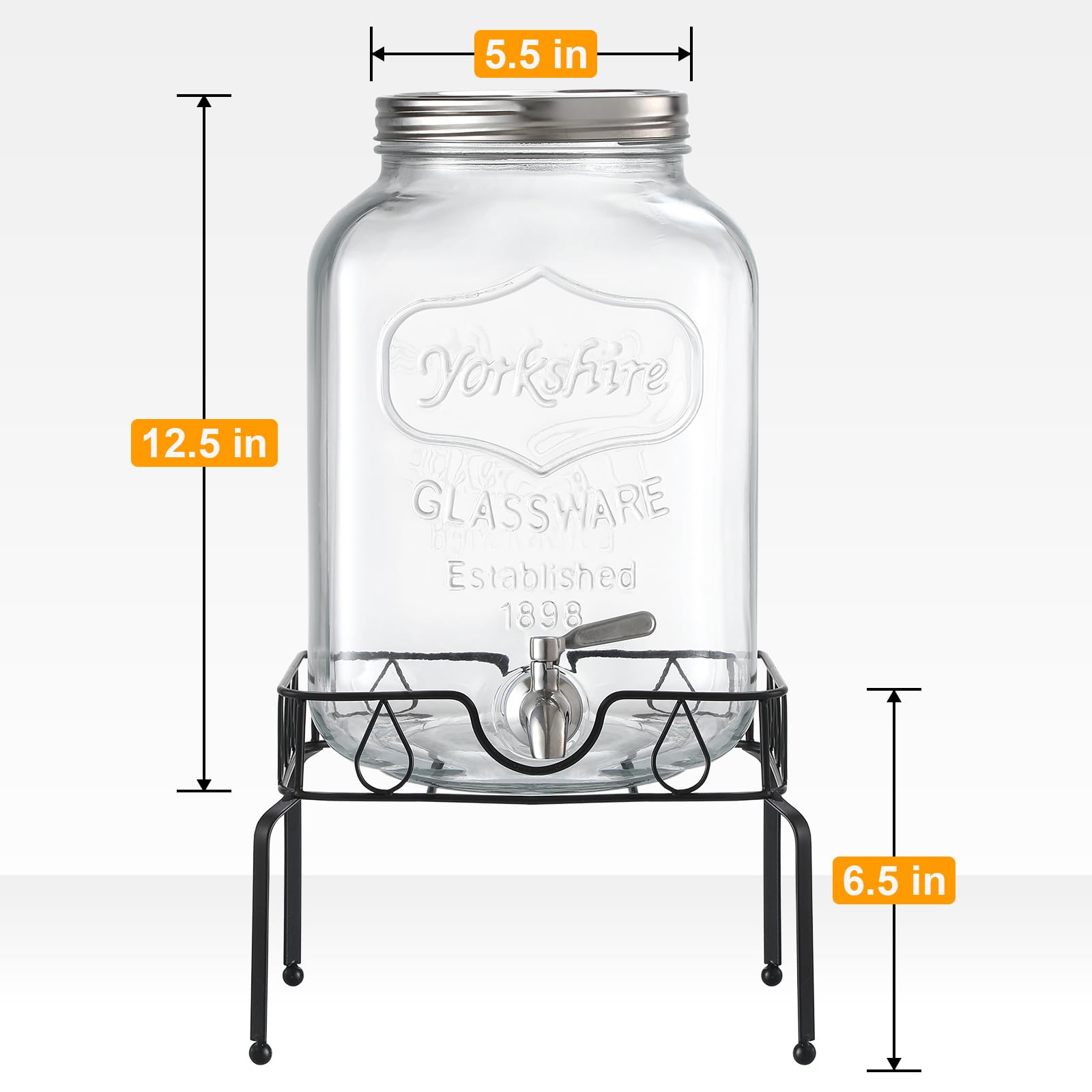 - Included with the dispenser are a blackboard label, and spigot. The dispenser measures 8"L x 6.5"W x 12.5"H. The dispenser on stand total measures 9.2"L x 6.9"W x 16.8"H.