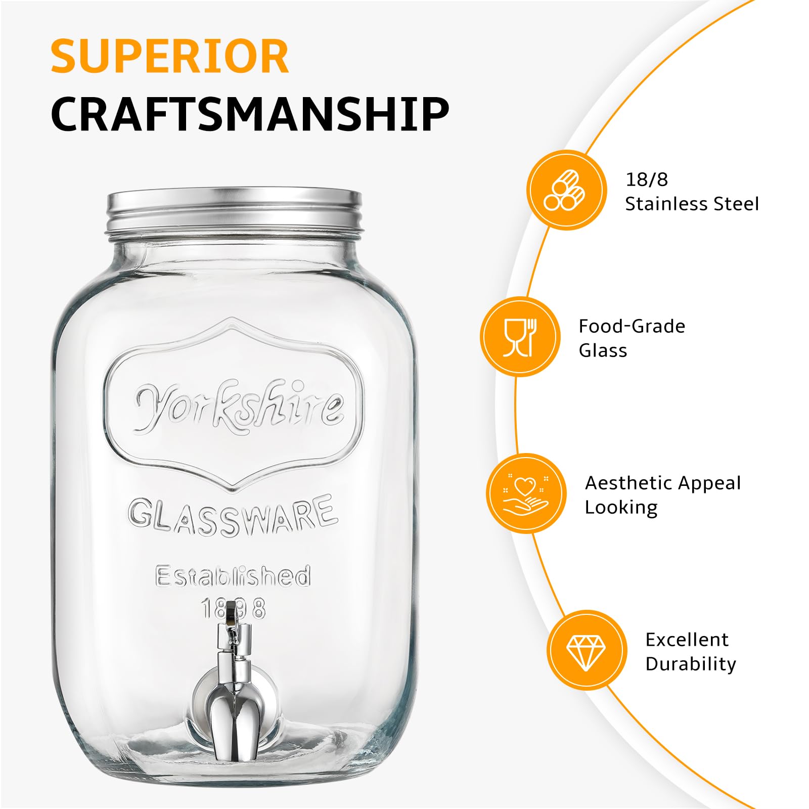 - Crafted from high-quality food-grade glass, our 2-gallon drink dispenser is a sturdy and durable alternative to acrylic and plastic dispensers. The thick glass is less prone to cracking and deformation compared to plastic, making it perfect for serving iced drinks without the risk of freezing and bursting the bottle. The crystal clear glass give the dispenser a beautiful and attractive appearance, making it an ideal centerpiece for any party.