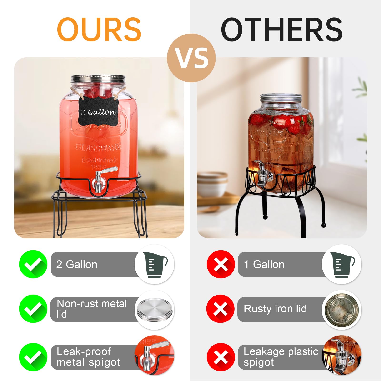 2 Gallon Glass Drink Dispenser For Parties,Beverage Dispenser with Stand,Lemonade Dispenser with 18/8 Stainless Steel Spigot Leakproof for Sun Tea,Homemade Juice,Picnic
