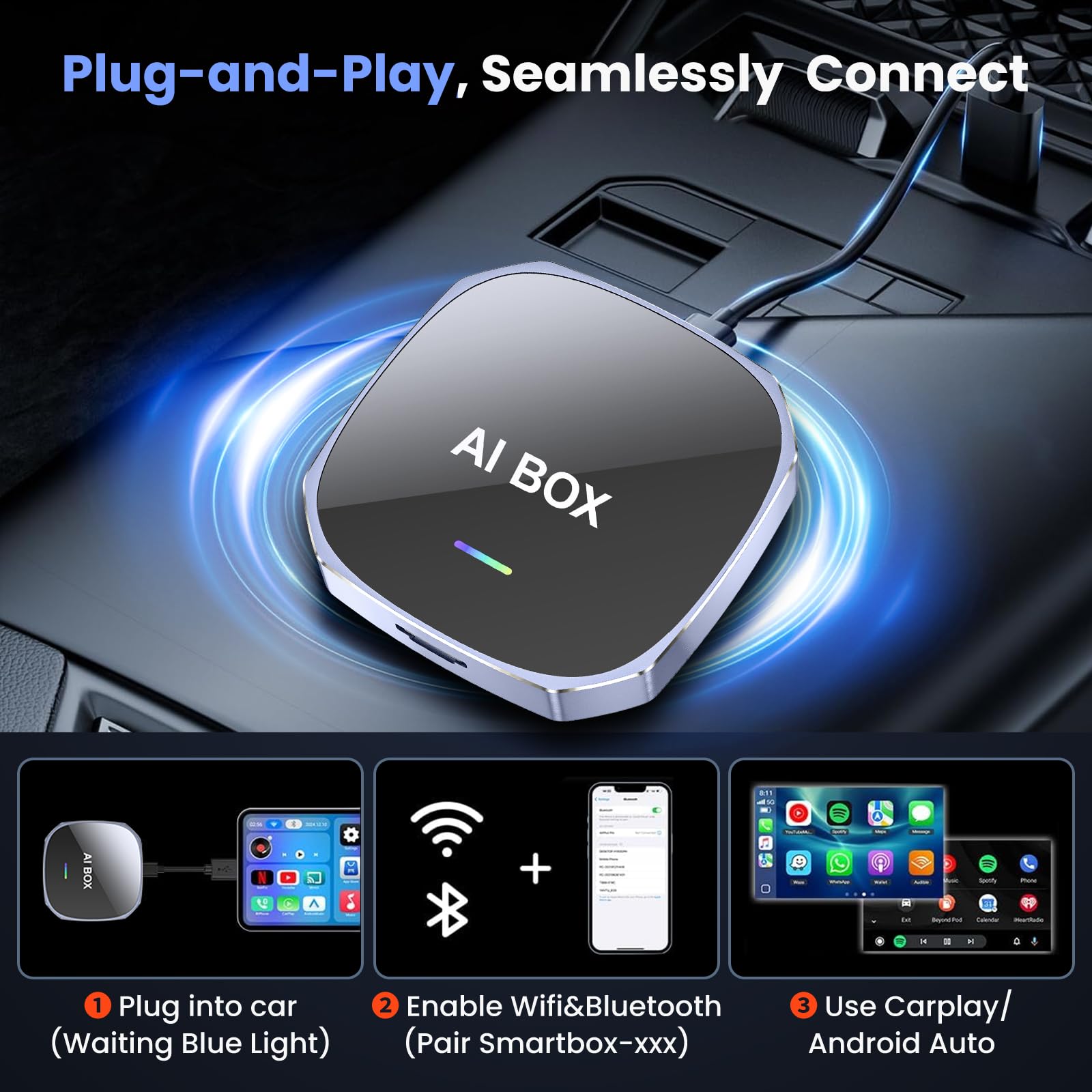 - ⚡ Plug & Play – Simple 4-Step Setup: Forget about complicated installations! Setup takes only 4 steps: ① Plug into your car (blue light = ready) ② Select CarPlay/Android Auto on car's screen ③ Enable WiFi & Bluetooth on your phone ④ Pair with “Smartbox-xxx” and enjoy. Once connected, the AI Box CarPlay adapter will automatically reconnect every time you start your car.