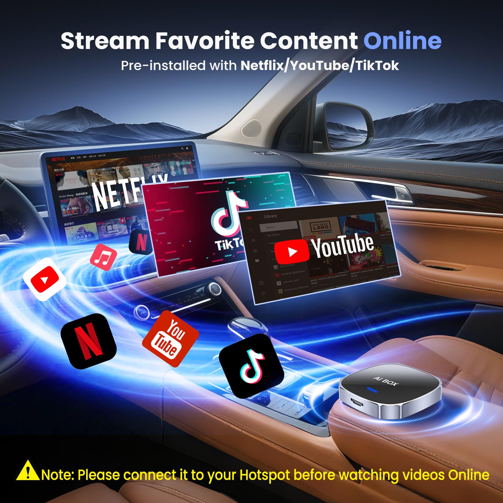 - 🎬 Built-in Netflix & YouTube – Premium In-Car Entertainment: This CarPlay AI Box / Magic Box has pre-installed Netflix and YouTube apps, so you can stream your favorite movies, shows, and videos directly on your car’s display. Plus, the built-in TF card slot allows offline playback of videos and music from a microSD card when no WiFi or hotspot is available. ⚠ Only supports built-in apps, third-party app installation is not supported. ⚠Before streaming Netflix or YouTube, please make sure to connect your phone’s hotspot or WiFi.