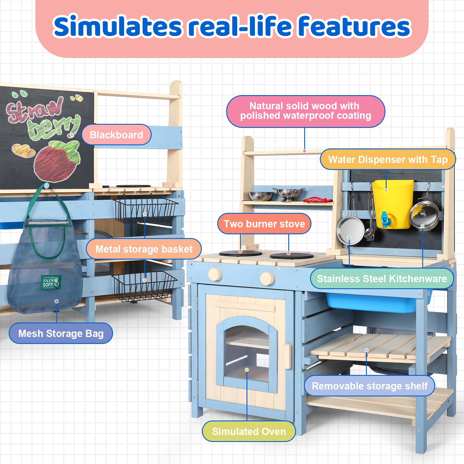 - [SELECTED SOLID WOOD]: Selected fir wood material, sturdy and durable. Our mud kitchen is supported by 4 solid legs to keep it stable and not easy to wobble. The rounded corners prevent children from bumping into it while playing.The surface of the product is carefully polished to prevent wood splinters from hurting children's skin.