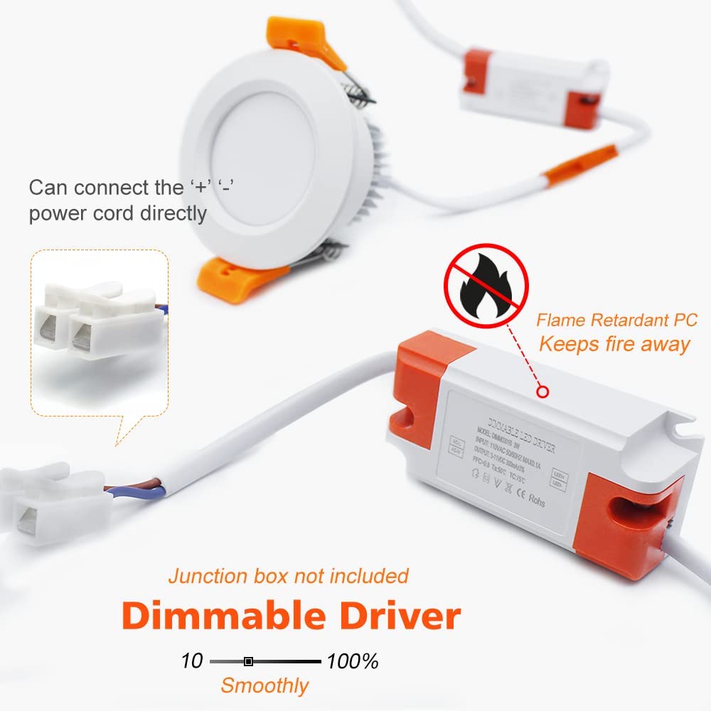 - Easy to install: LED dimming driver is included. Cut-Out size is 2.08 inch/53mm, front diameter is 2.75inch/70mm, perfect for 2.5'' hole. No extra can or accessories are needed.This Recessed LED lights kit can be easily fitted to replace ordinary 2.16 - 2.5 inch recessed light fixture