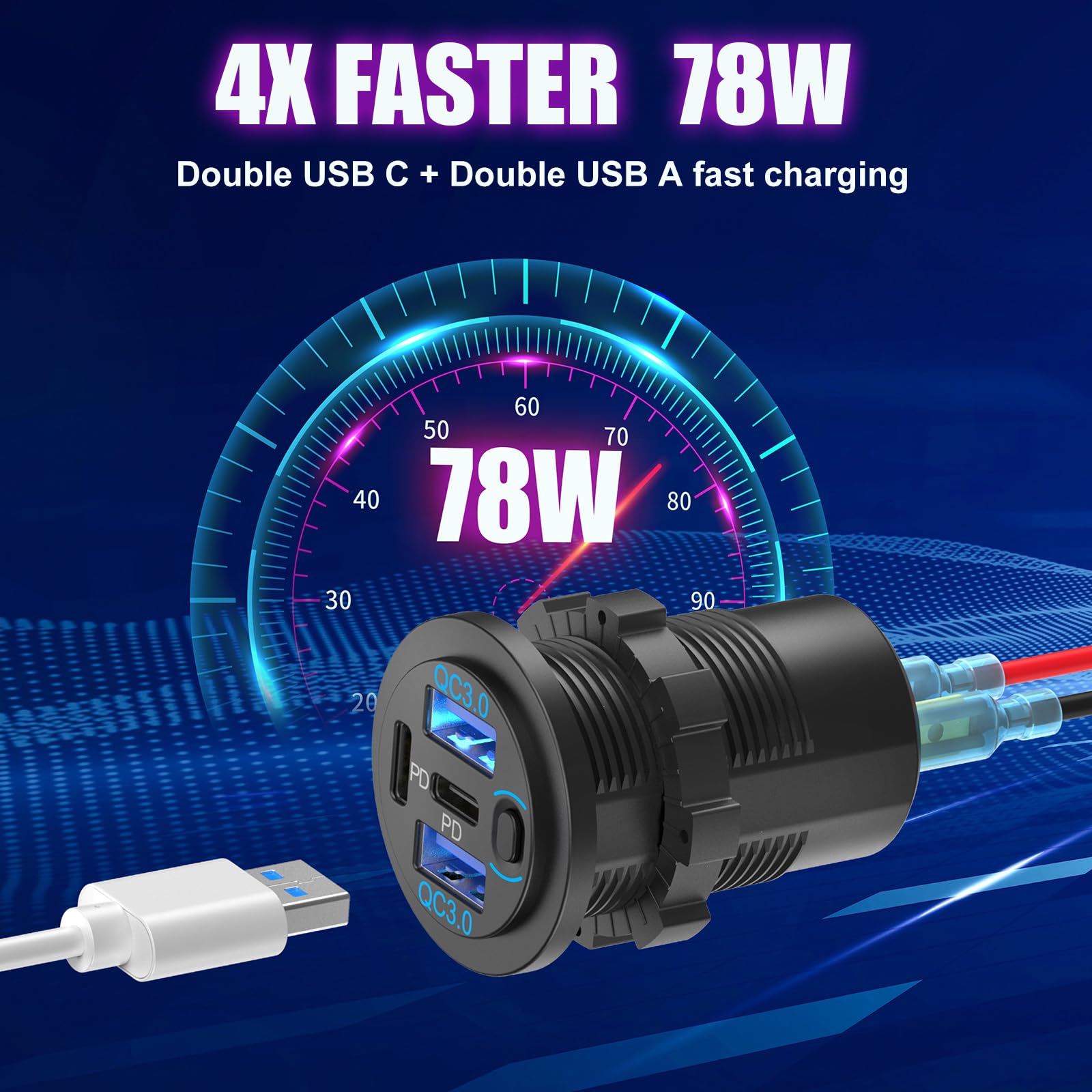 - SUPER FAST 4-PORT VERSION: Our 12V USB outlet is upgraded to four USB ports, 2 PD 30W + 2 QC 18W, which can charge four devices at the same time and up to 78W output. Compatible with PD2.0, QC2.0/1.0 and all other protocols, providing the fastest charging speed for all devices.