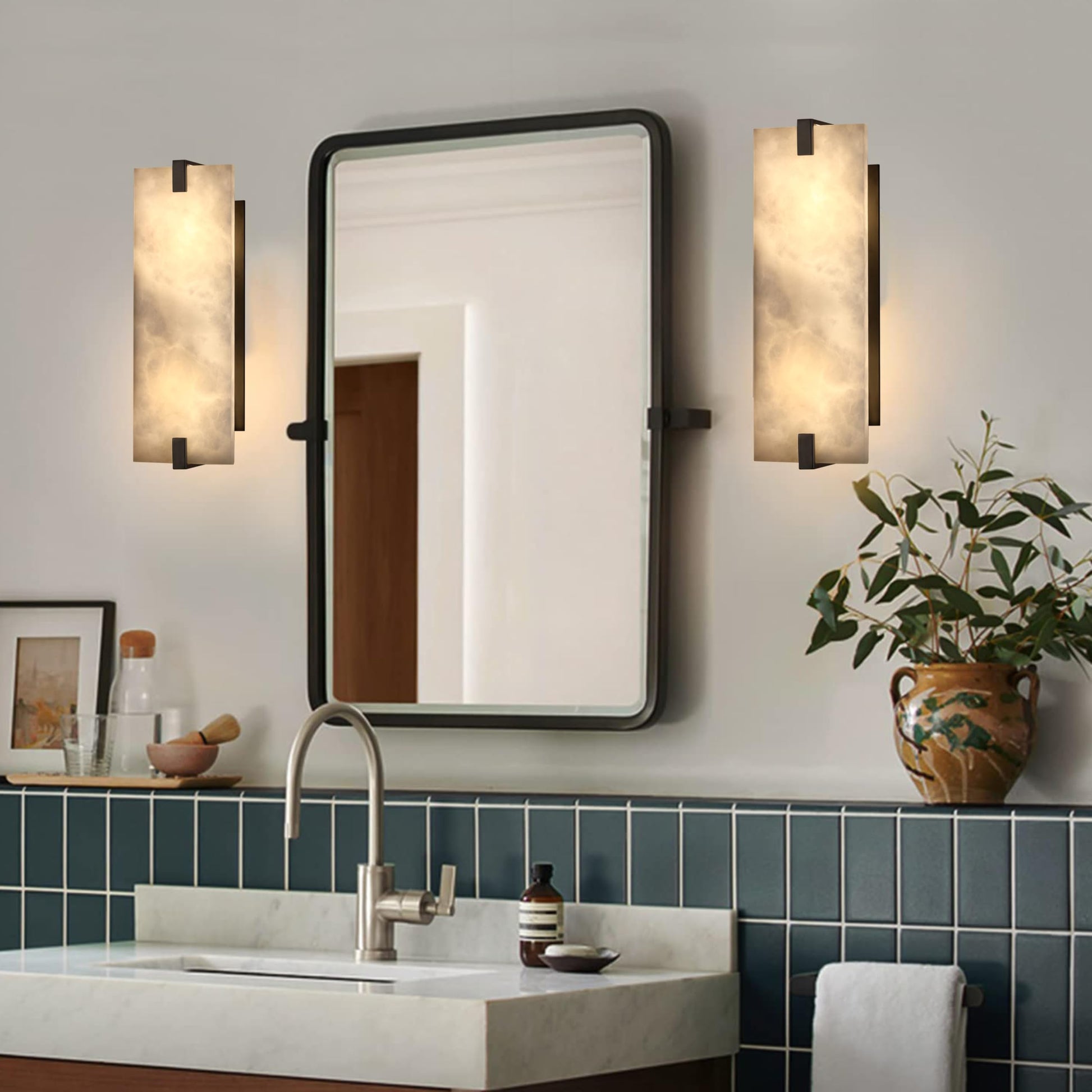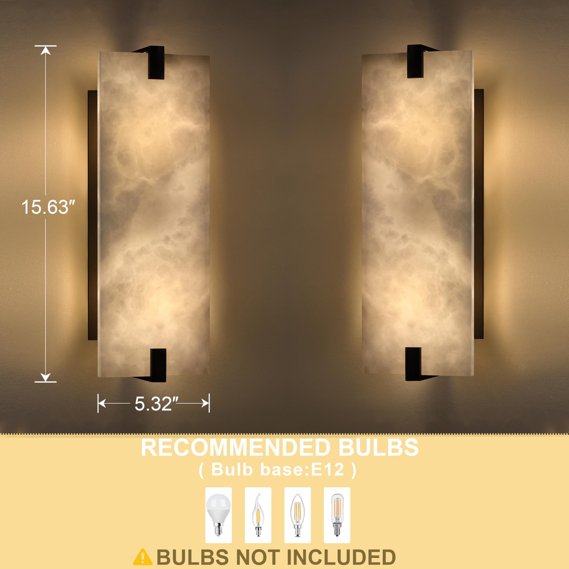 Details: 2 Pack 2 Light 15.63" Natural Square Alabaster Marble Bathroom Wall Sconce Modern Concise Style Wall Light Fixture,Black Finish for Bedroom Hallway Bedside Living Room