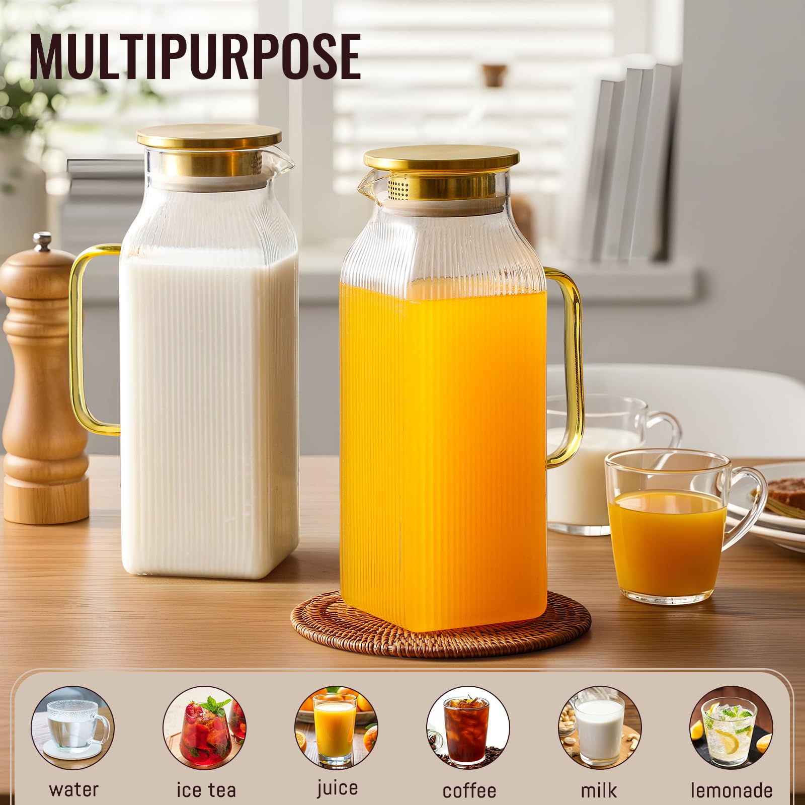2 Pack 2 Liter/68 oz Square Glass Pitcher with Lid, Classic Stripes Water Pitchers with Handle for Fridge, Large Jug for Iced Tea, Coffee, Borosilicate Glass Carafe for Hot/Cold Brew Drink, Gold