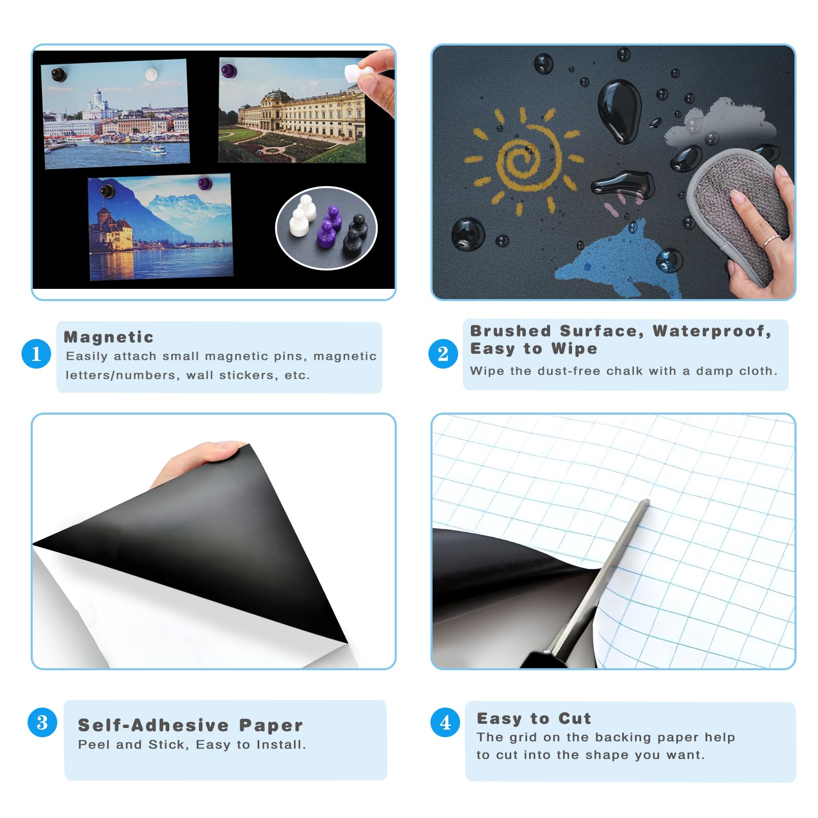 - Magnetic Surface: Our self-adhesive chalkboard sticker transforms any smooth, non-textured surface into a creative, large magnetic board or wall. This magnetic wall decal works great with wooden magnets, map puzzles, and other foam magnets. It’s also an ideal alternative to magnetic easels or magnetic paint. You can even stick it to the back of a door to create a travel photo wall