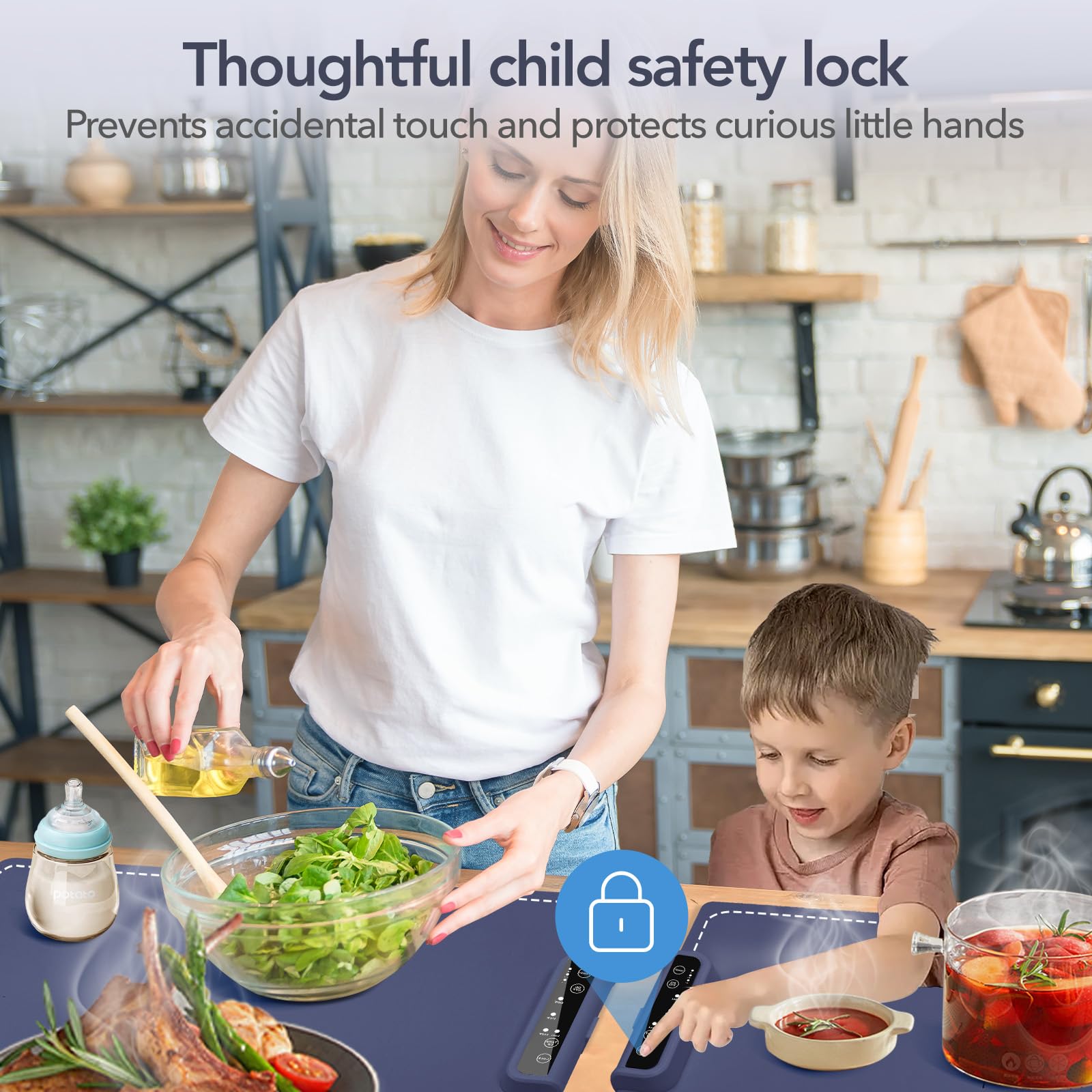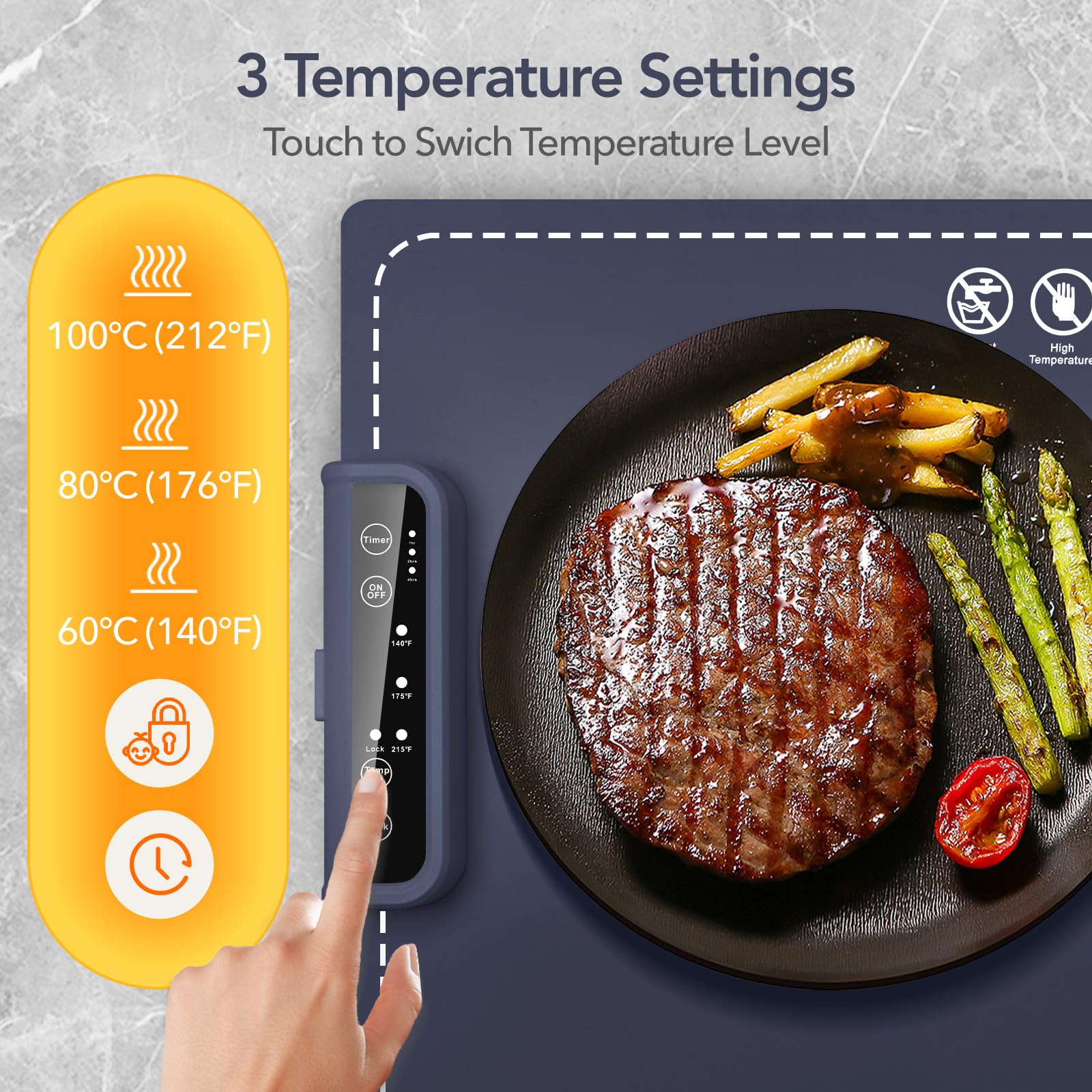 - Efficient Intelligent Control: The electric heating pad features advanced directional heating technology, ensuring an efficient heating experience. It also includes a built-in child lock for added safety and offers adjustable temperature settings (140°F, 175°F, 215°F) and timer options (1H, 2H, 4H), enabling you to prepare meals efficiently. This warming tray can meet your needs all year round, enhancing the convenience of your daily life.