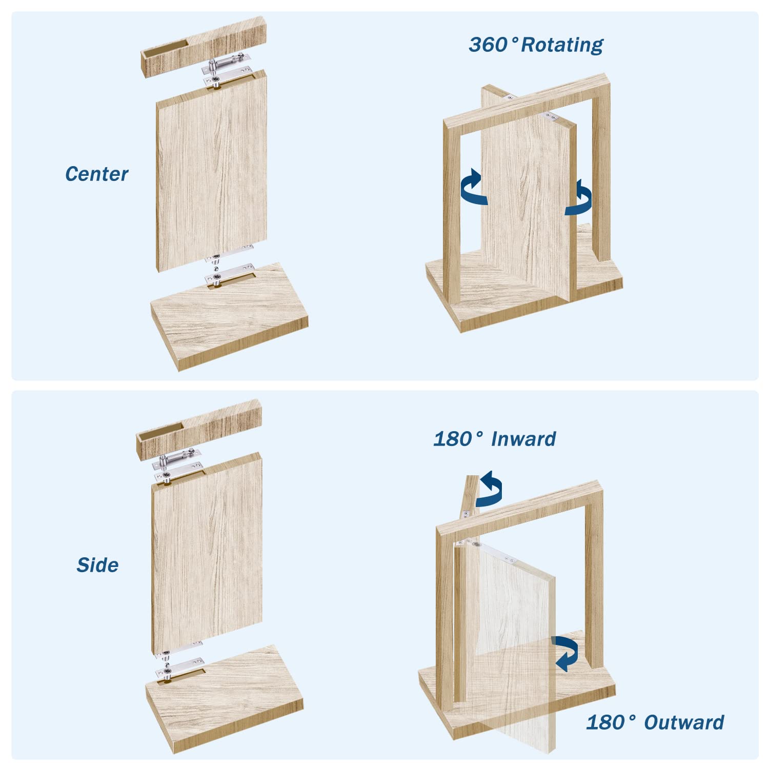 - 【Achieving a sleek and seamless look】:to add a touch of mystery and elegance to your space with this pivot hinge. You can create a hidden door that rotates 360 degrees. Whether you want a Bookcase Door, a Bookshelf Door, a Secret Door, or a Hidden Room, this pivot hinge can handle it.