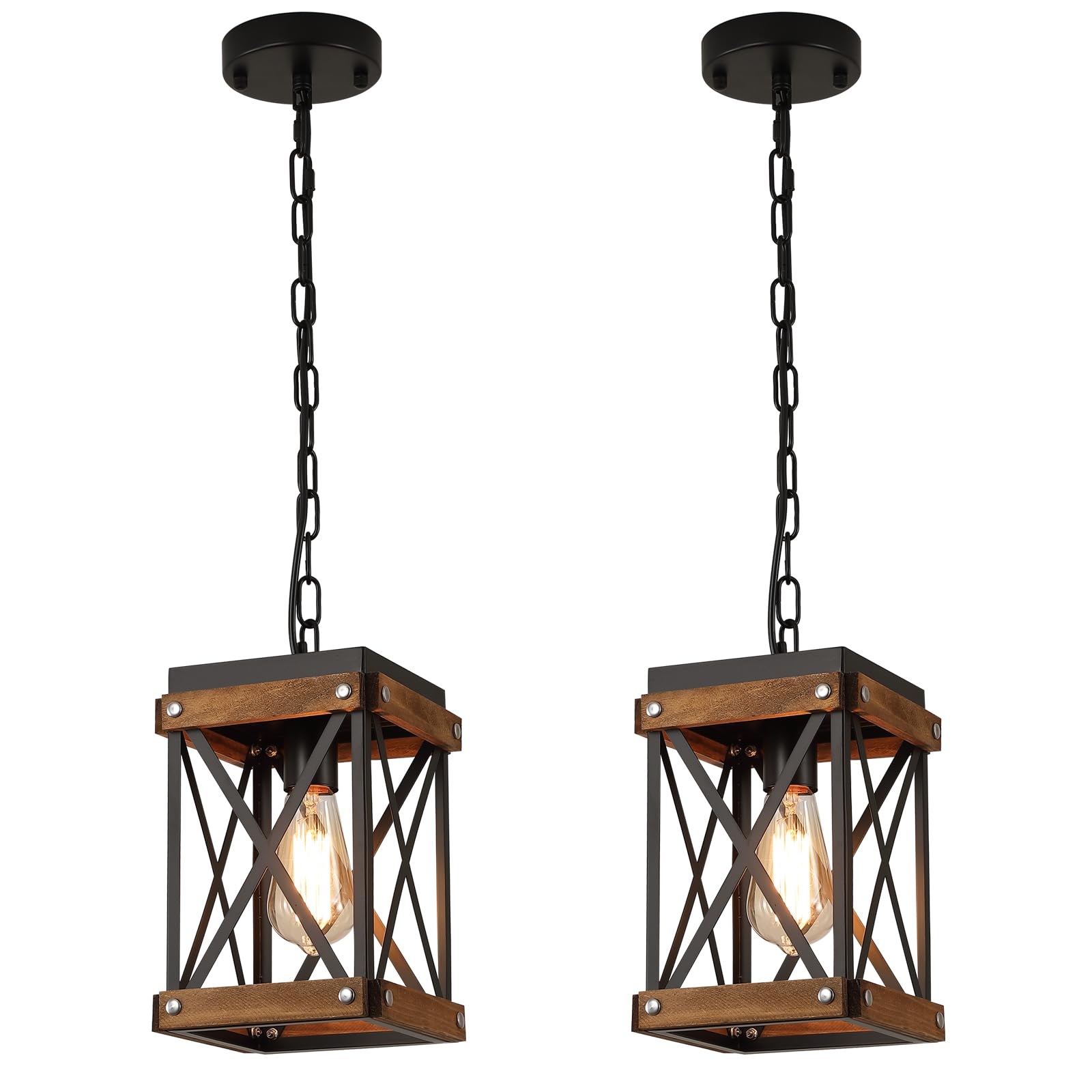 2 Pack Rustic Farmhouse Wood Pendant Light Fixture One-Light Adjustable Chain Oak Wood and Metal Lantern Cage Small Pendant Lighting for Kitchen Island Sink Hallway Farmhouse Bathroom Bar, Black