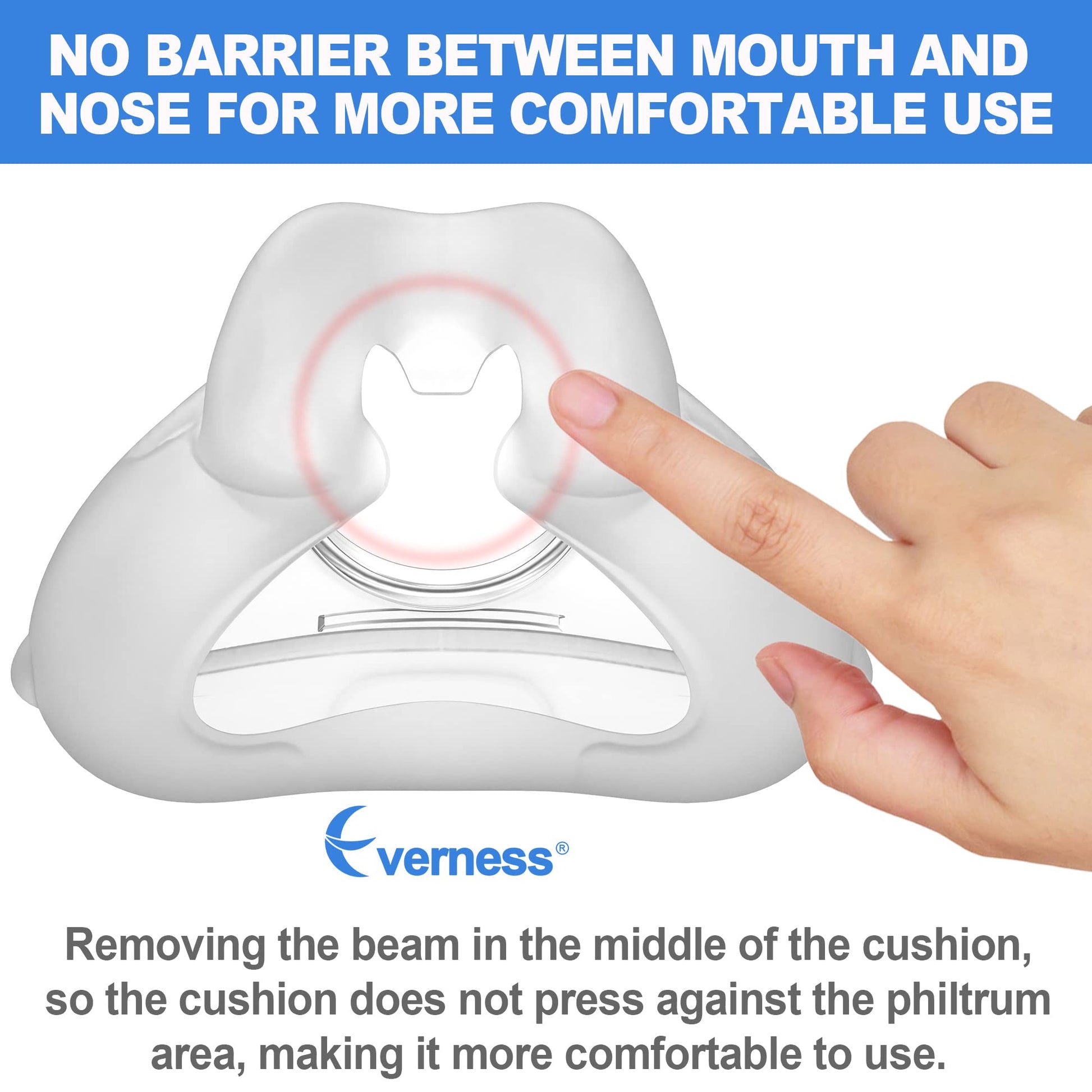 - COMFORTABLE TO USE - There is not a barrier between mouth and nose because we removed the beam in the middle of the cushion. With this design, the cushion does not press against the philtrum area, making it more comfortable to use.