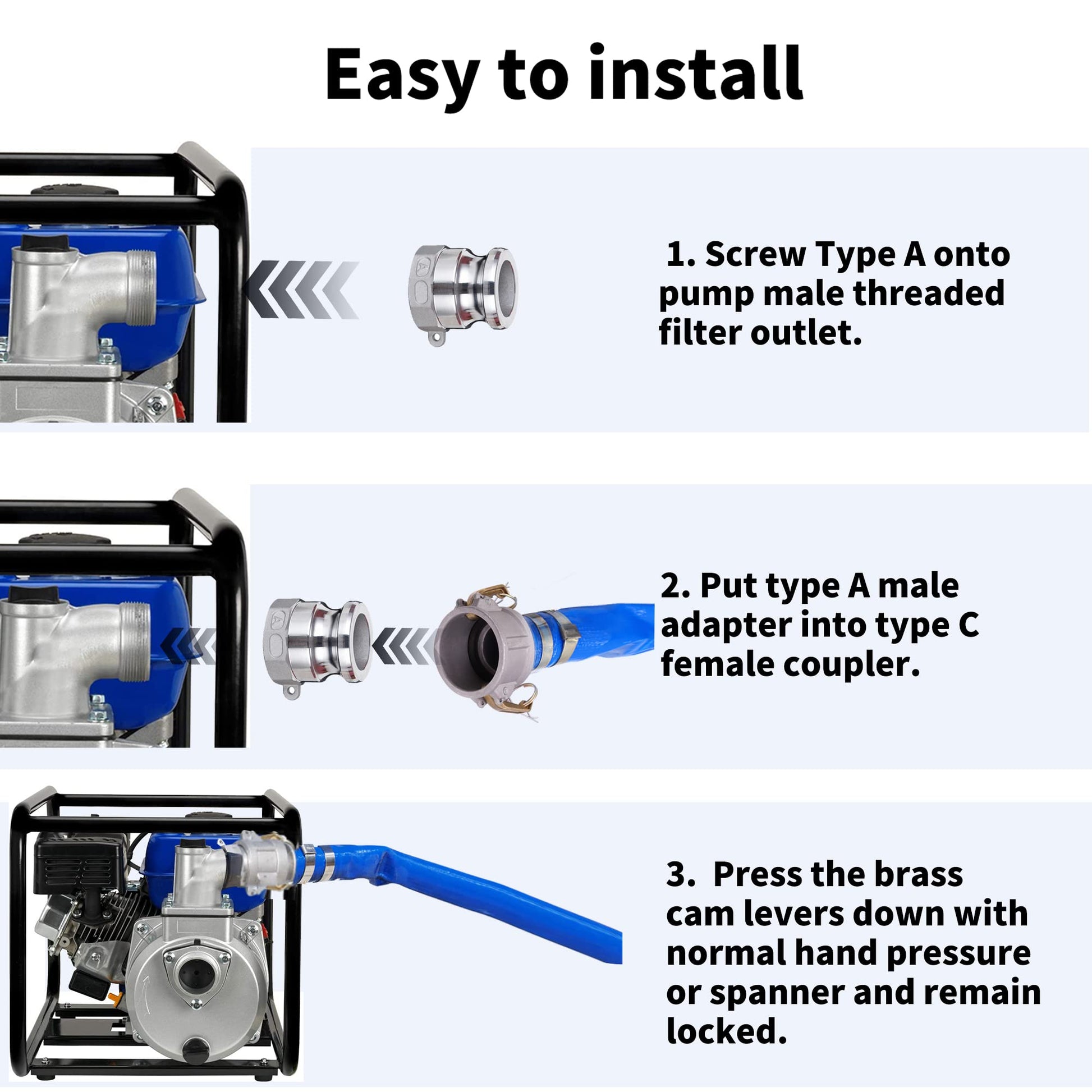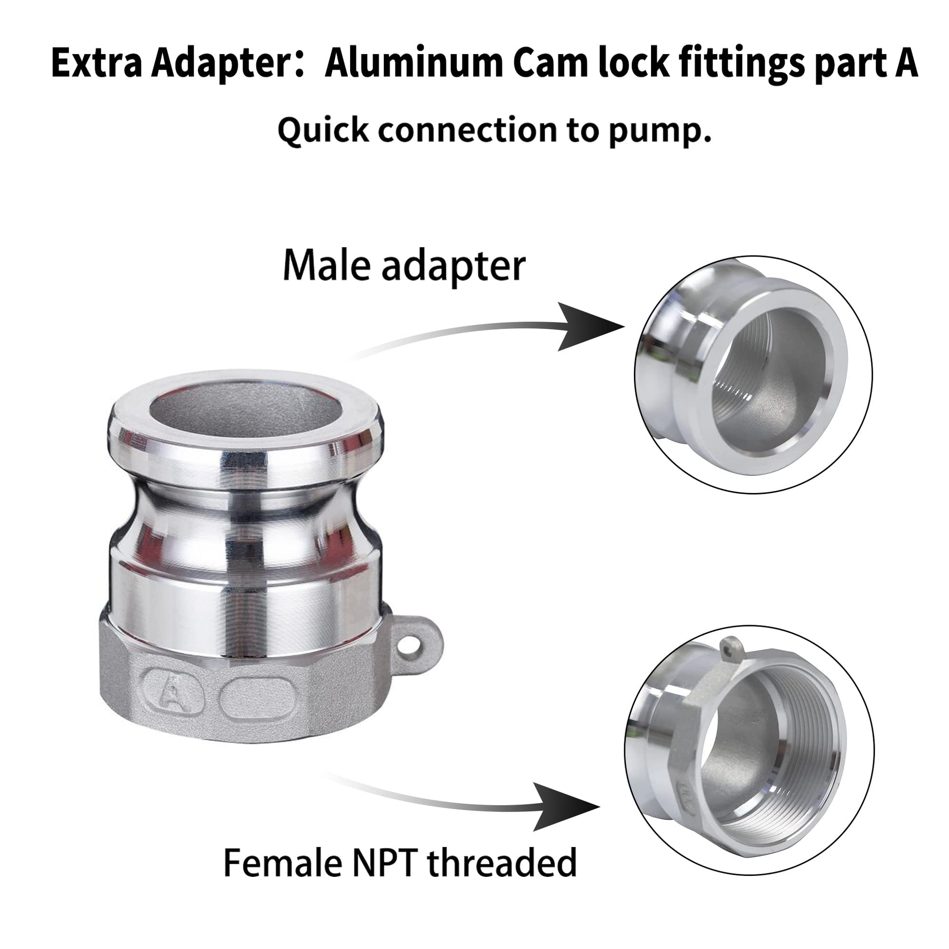 - [TYPE A FITTINGS]: The item include a type A (male adapter x female NPT threaded ) cam and groove hose fitting, you can directly screw onto pump male threaded outlet, then realize quick connect or disconnect between discharge hose assembly with pump