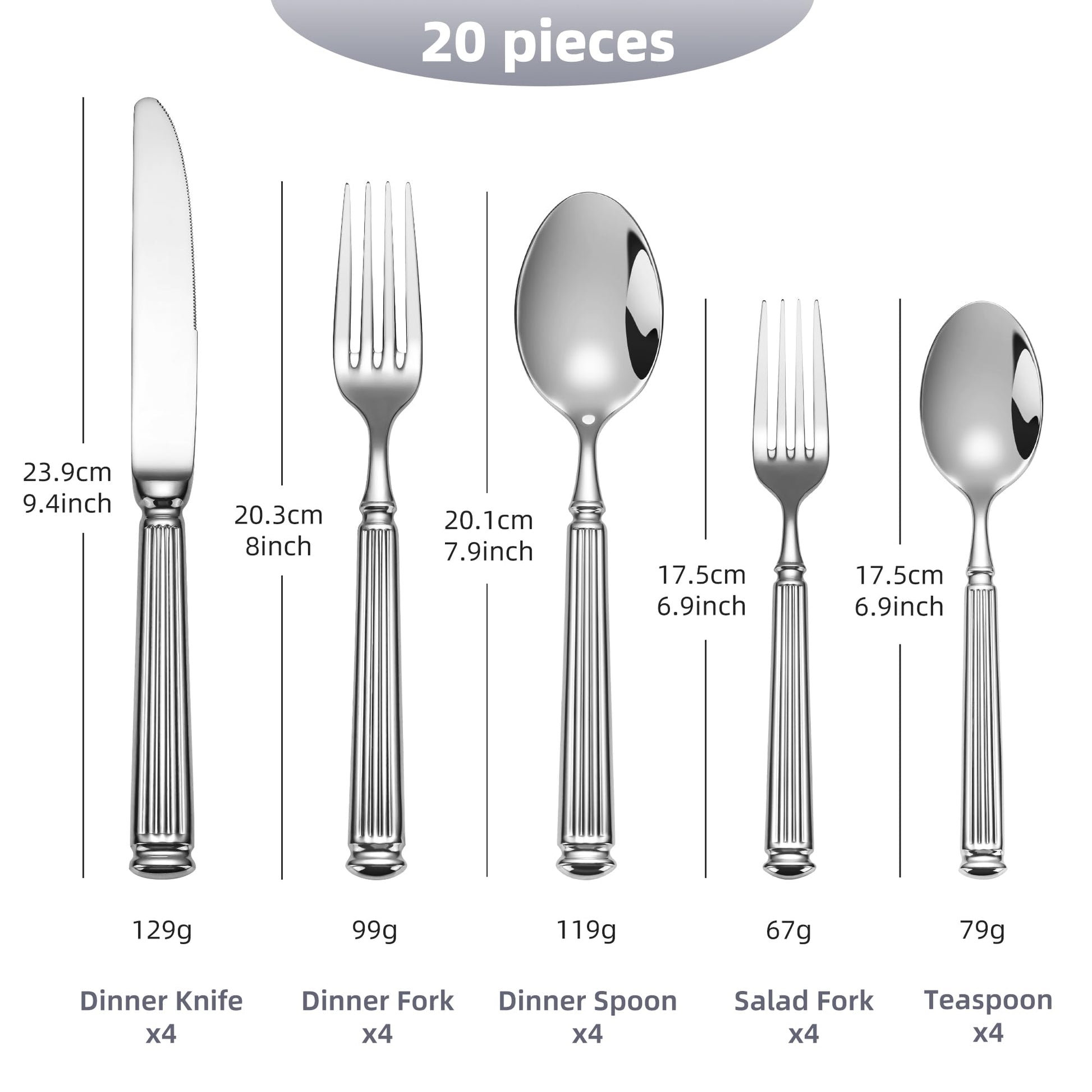 - 20-PIECE SET: Includes 4 each of dinner fork, salad fork, dinner knife, dinner spoon, and teaspoon