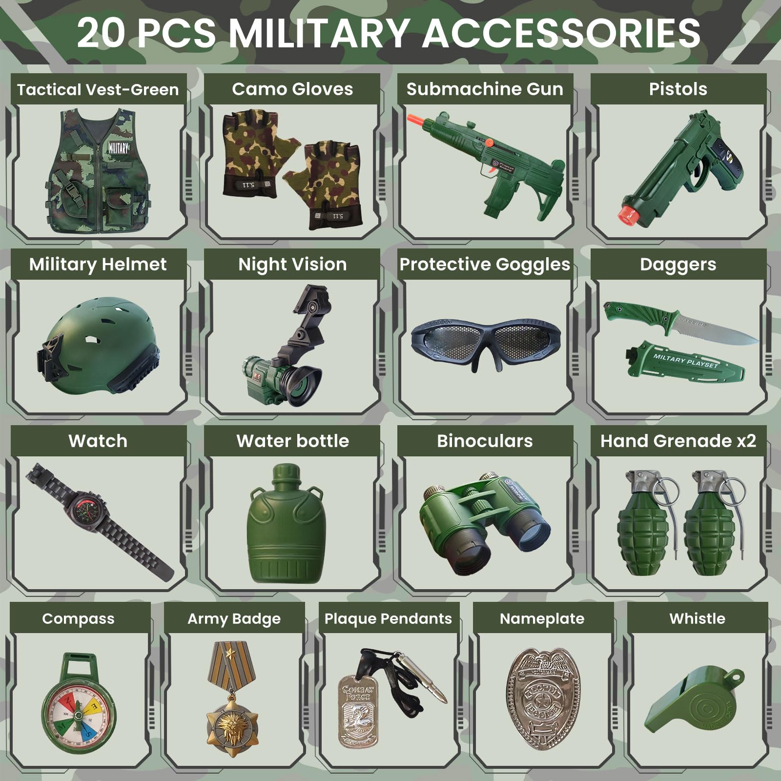 - Deluxe Kids Army Costume Set:ZIRSENG army role play set includes tactical vest (green), camo gloves, submachine gun, pistols, military helmet, night vision, protective goggles, dagger, watch, water bottle, binoculars, compass, 2 hand grenades, army badge, plaque pendants, nameplate, whistle. Every accessories your little one will need and be entertained for hours fun!