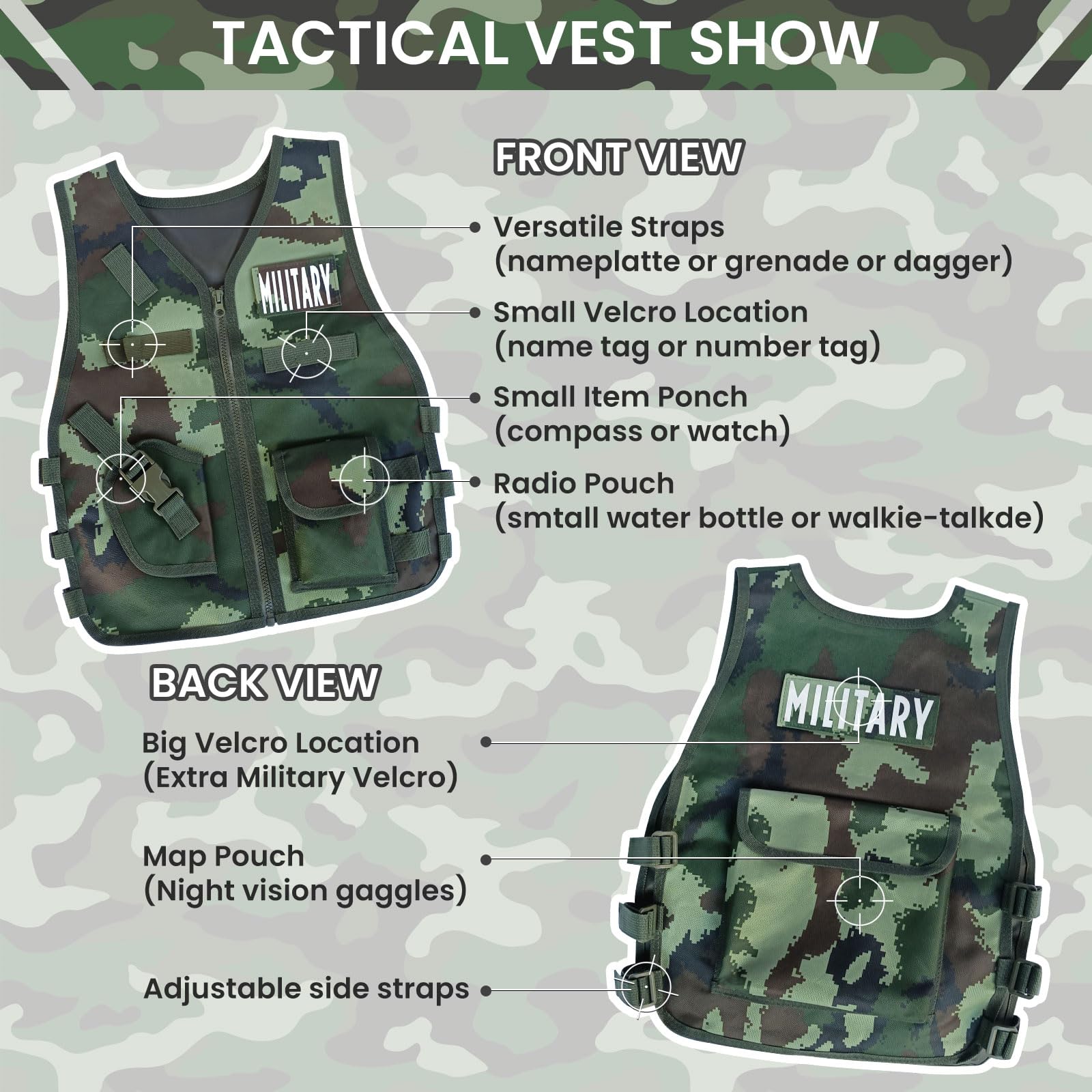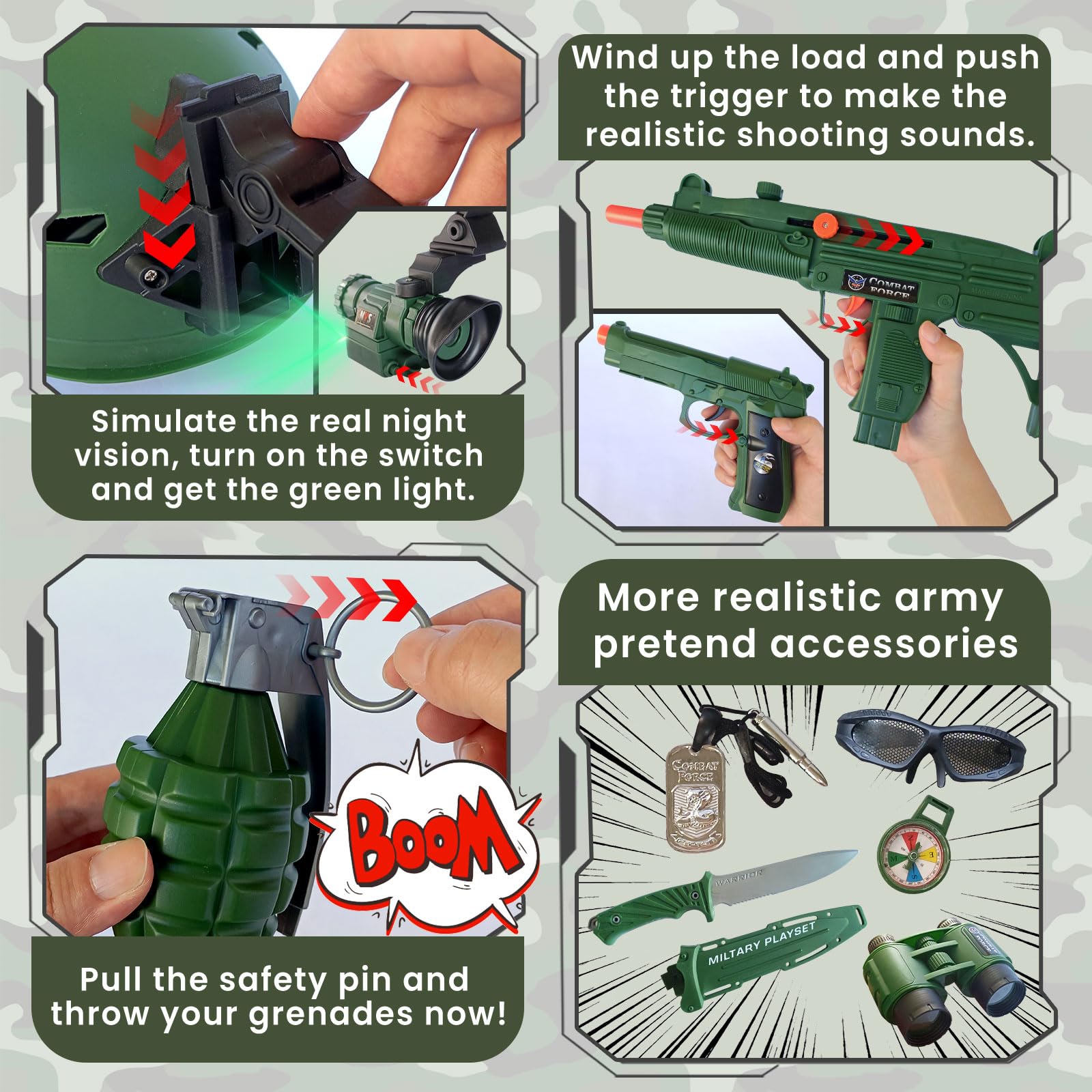 - Realistic Details Kids Army Gear:To increase the pretend fun game of playing, we upgraded the design of all items with more complete realistic details accessories. It is more closer to the real soldier's equipment. Multi-pockets vest could store more equipments and the non-slip gloves could be adjusted for size. Sufficient accessories will surprise your child every time play.