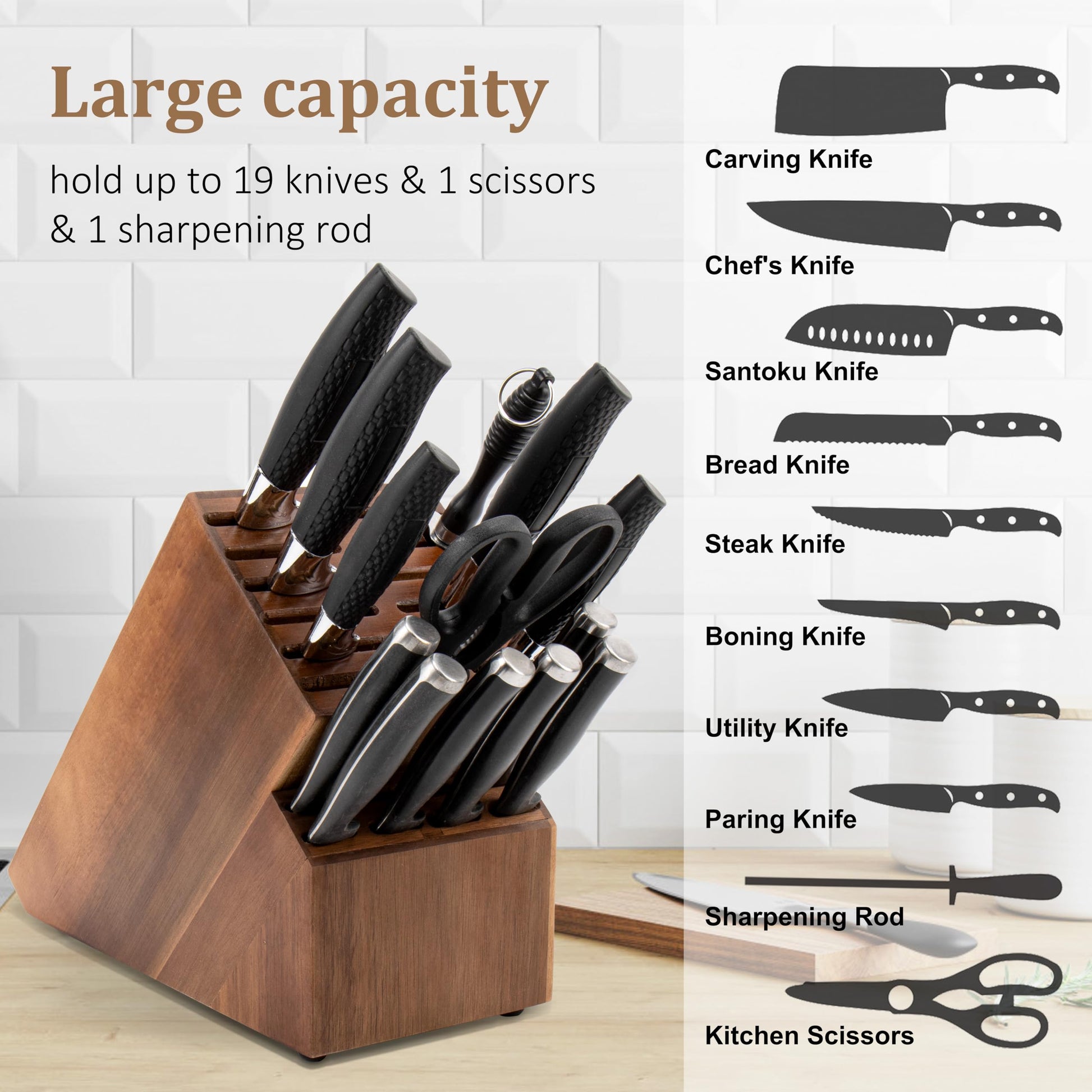 - 20 Slot Universal Knife Block: This kitchen knife block storage holds up to 19 knives, has extra slots to store kitchen scissors and sharpening rod; Excellent slope design, easier to extract and place the knife, each operation is smooth and comfortable.