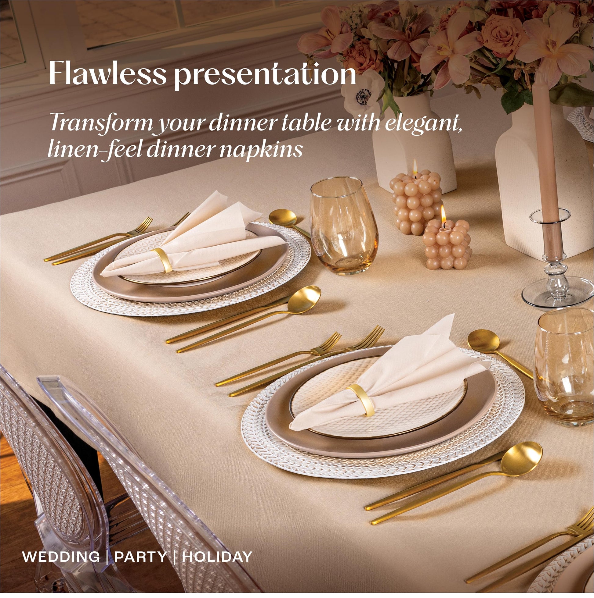- TOUCH-OF-LINEN DINNER NAPKINS: These Paper napkins have the look and feel of cloth linen, but with the cost effectiveness and disposable convenience of disposable napkins.
