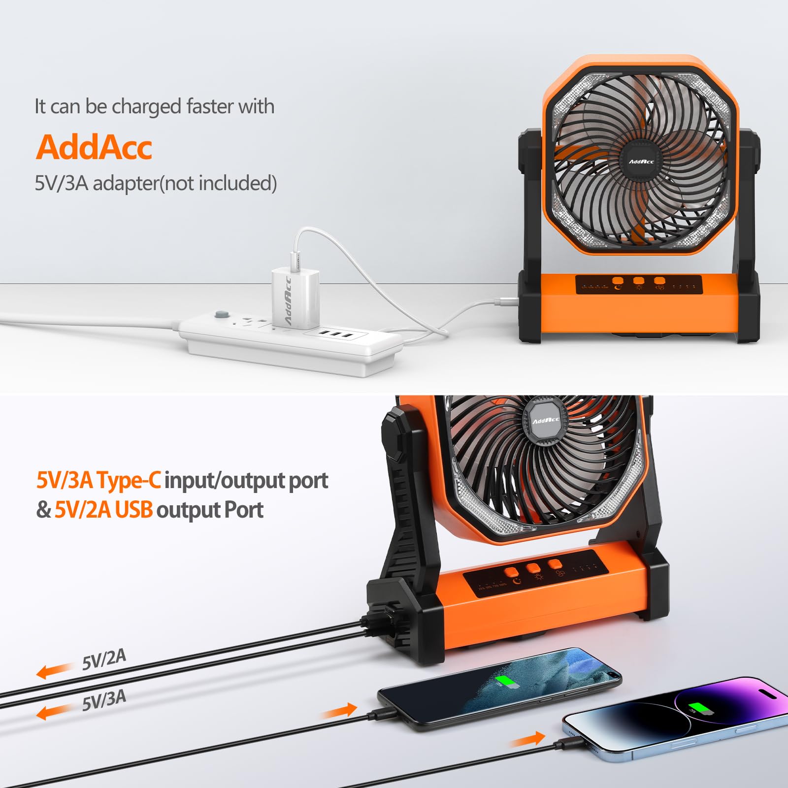 - 20000mAh Mighty Battery: AddAcc camping fan delivers up to 58 hours of continuous use in low speed, it will take approximately 10-12 hours to fully charge via standard adapter. for faster recharge, we highly recommend you choose the AddAcc 5V/3A 20W USB C Charger Block (save $8 CODE: VIYN8HO7 ), Say goodbye to battery anxiety during camping trips, hurricanes, or emergency power outages. The 5V/3A output port ensures your essential devices—like phones, GPS, and other camping gear stay charged and ready to go (Adapter Not Included)