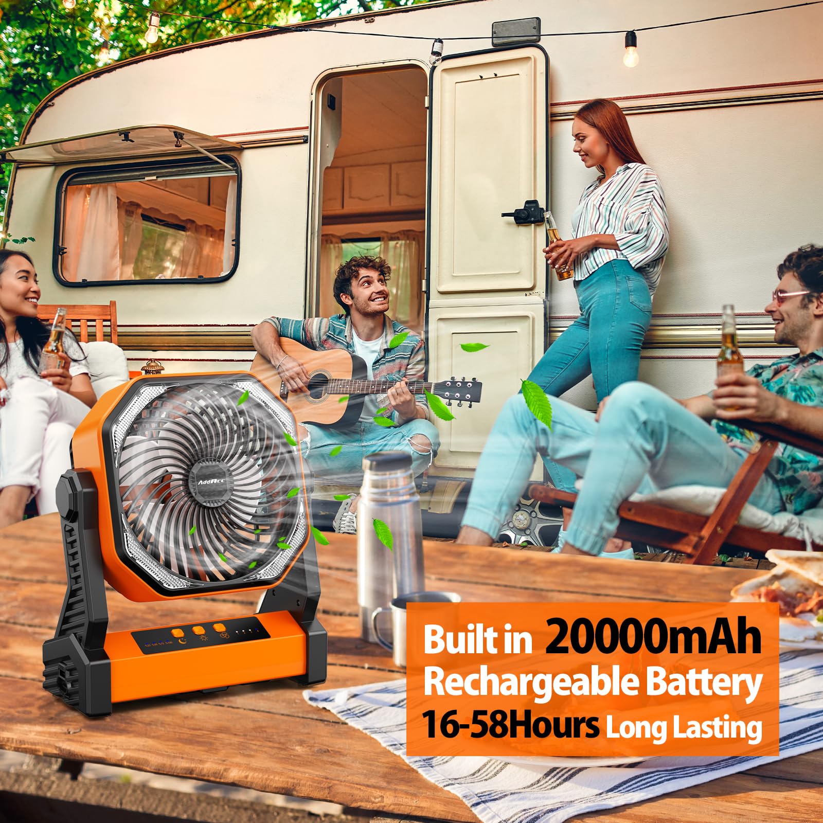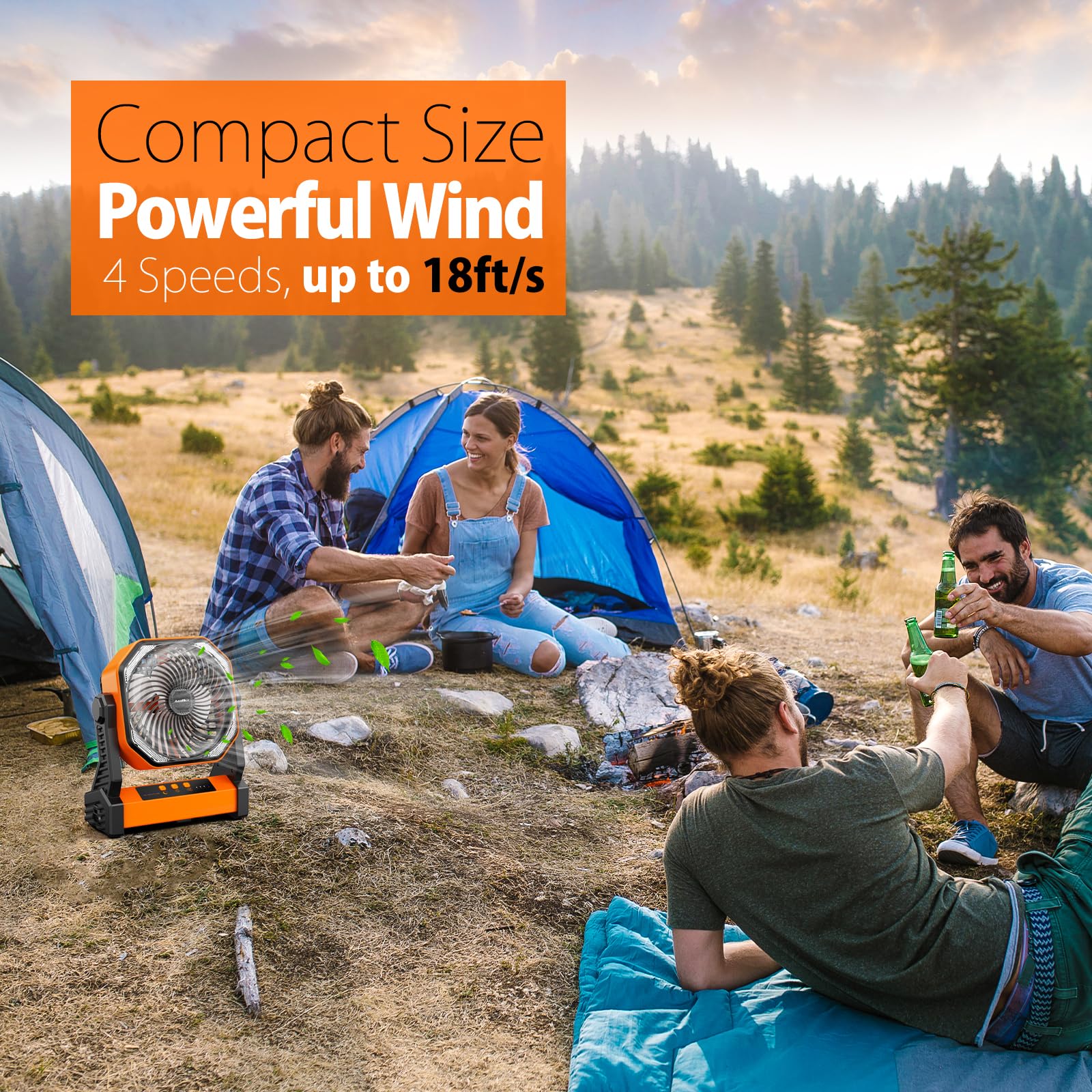 20000mAh Camping Fan, Rechargeable Battery Operated with 360° Rotatable Hook, 400 Lumes Light, 270° Pivot, 4 Speeds, 58Hrs Battery Powered Fan for Outdoor Tent Car Trip BBQ Hurricane Power Outages