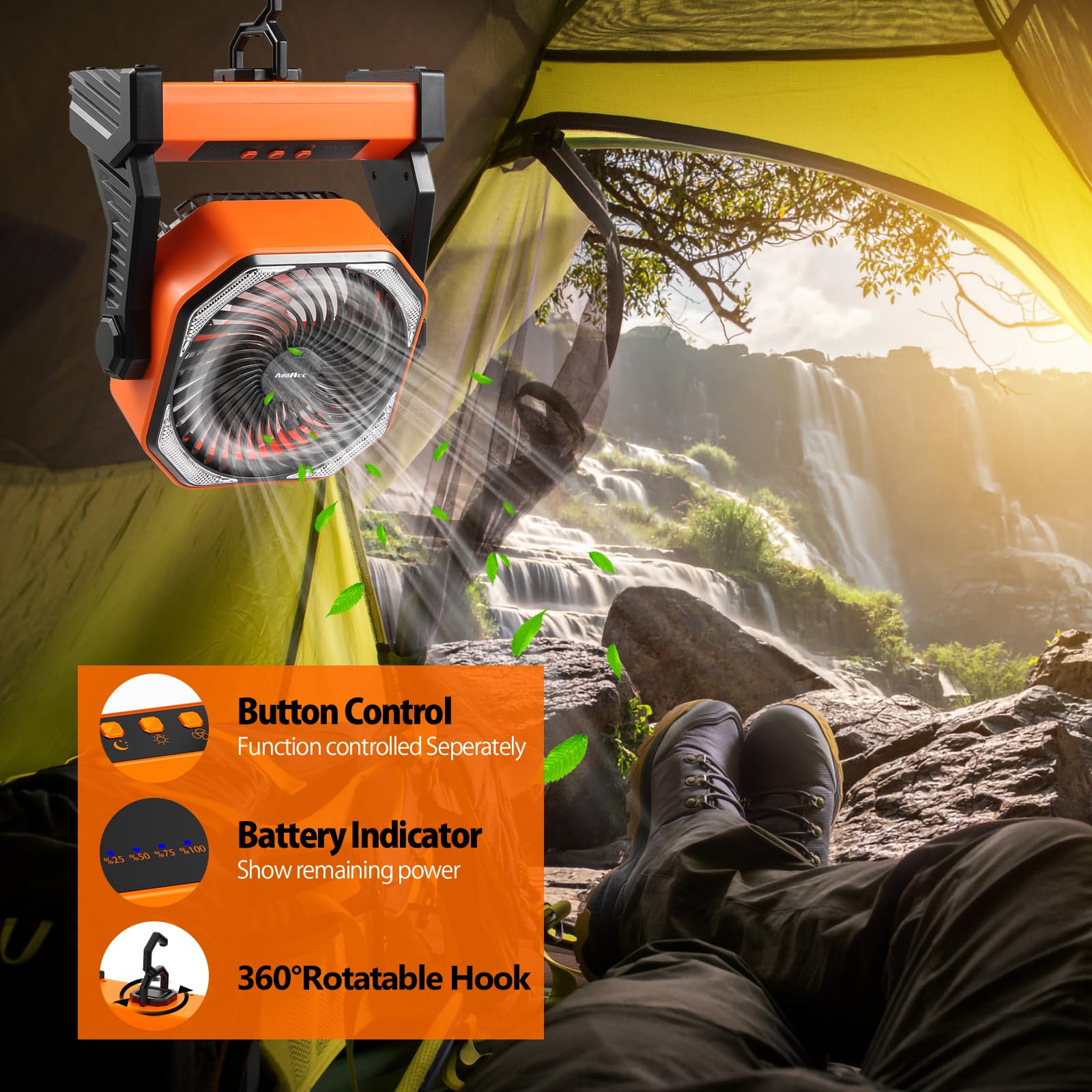 - Adjustable Angle & 360° Hanging Hook: Equipped with a 360° rota-table foldout hook, this tent fan easily hangs from tents, branches, or cars, mimicking a ceiling fan. Its sturdy base allows use as a floor or desk fan, while 270° pivot provides a refreshing breeze from any angle you want