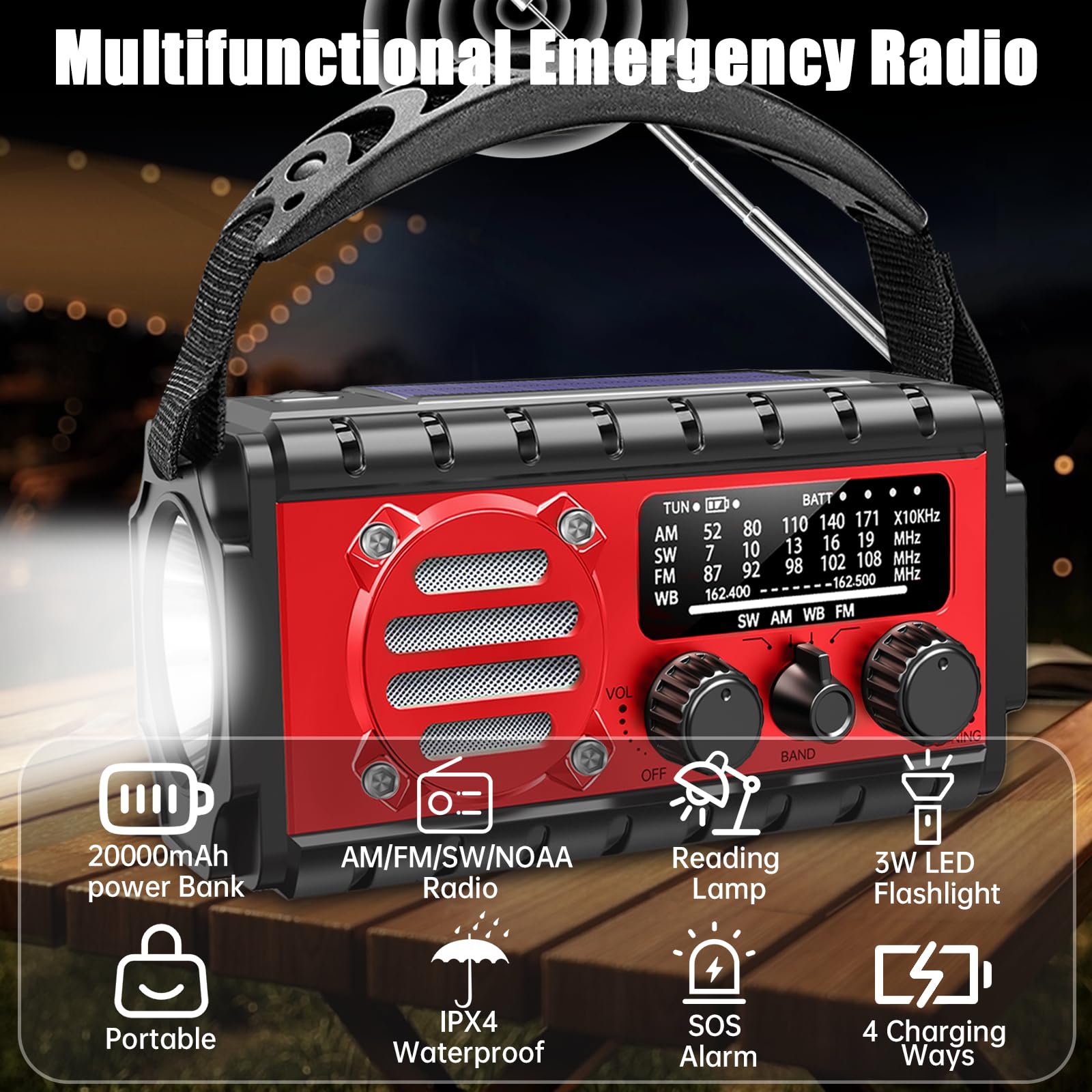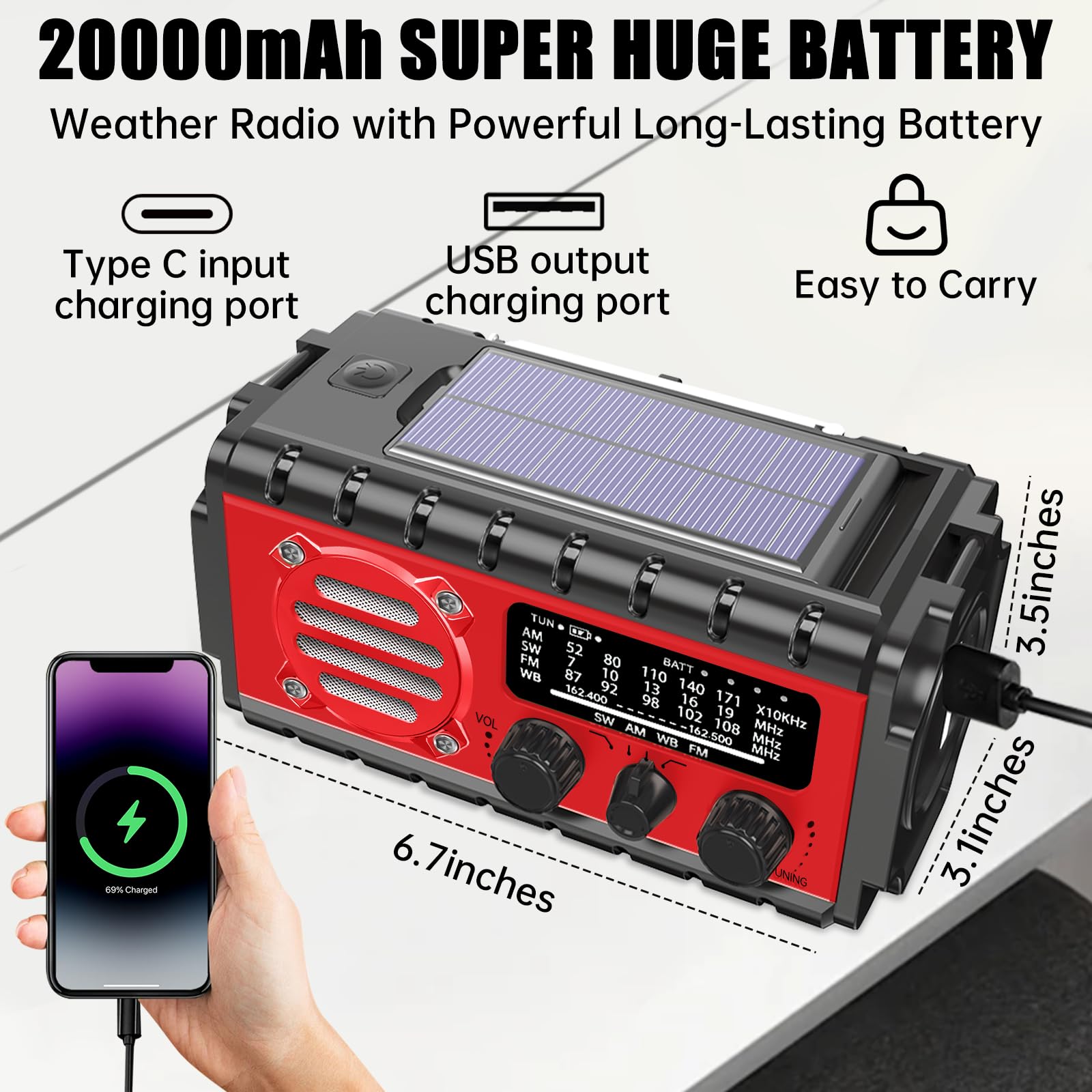 20000mah Emergency Radio, SW/NOAA/AM/FM Weather Radio, Solar Powered Hand Crank Charger with Big Battery Powered, Portable, Cellphone Charge, SOS, Flashlight for Emergency/Home